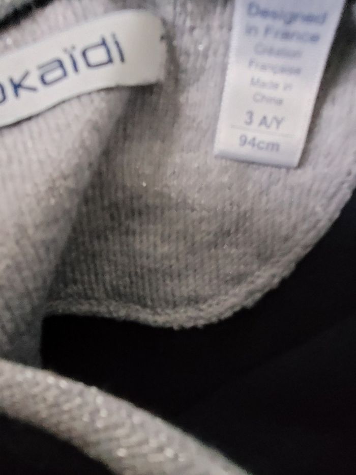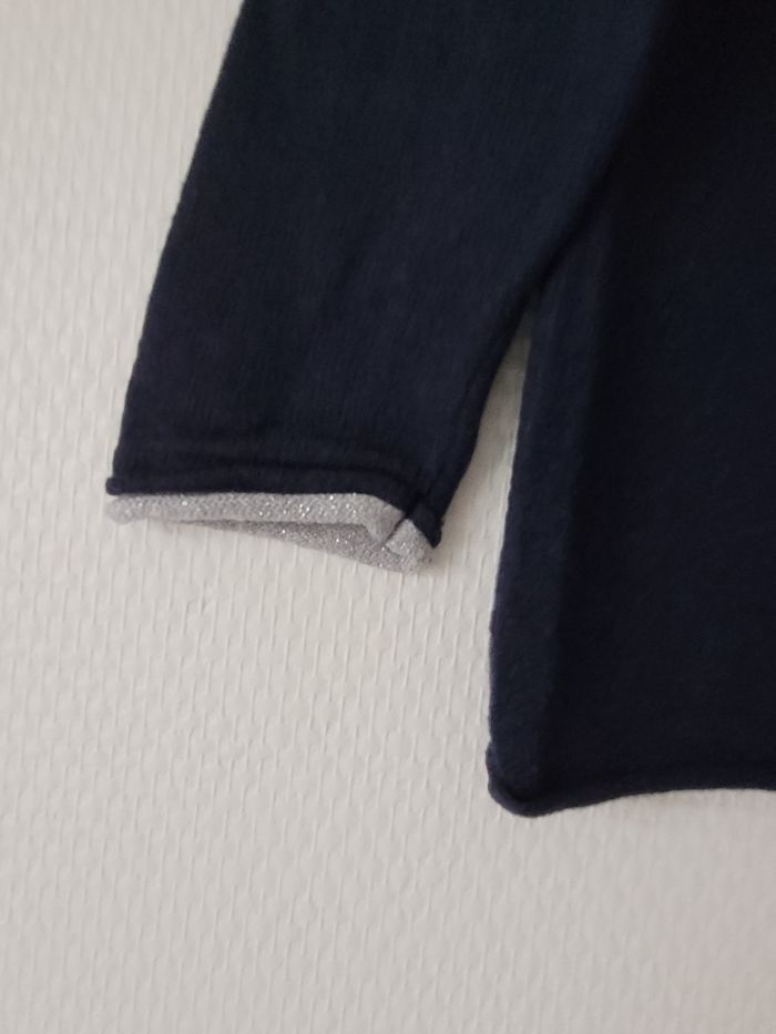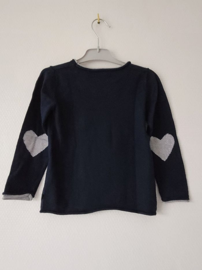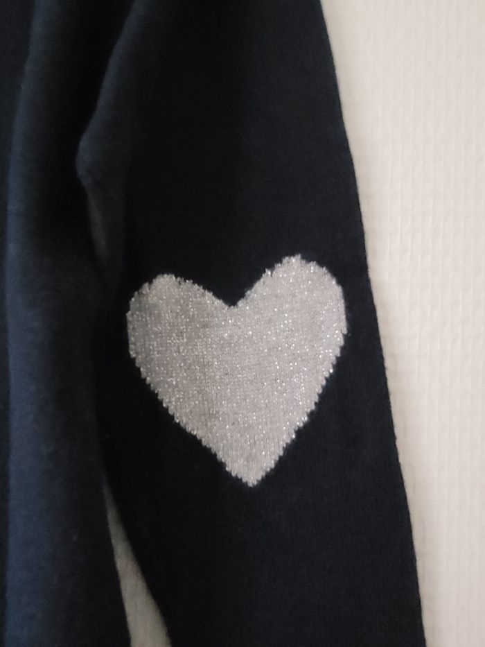 Pull bleu marine de marque Okaïdi taille 3 ans Liseré argenté au bord du col et des manches Petite poche à gauche de la poitrine Petits cœurs argentés au niveau des coudes En très bon état
