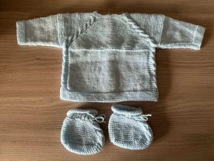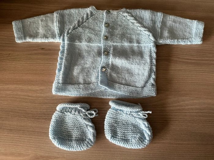Lot layette laine bleu clair gilet et chausson taille 3/6 mois - photo numéro 1