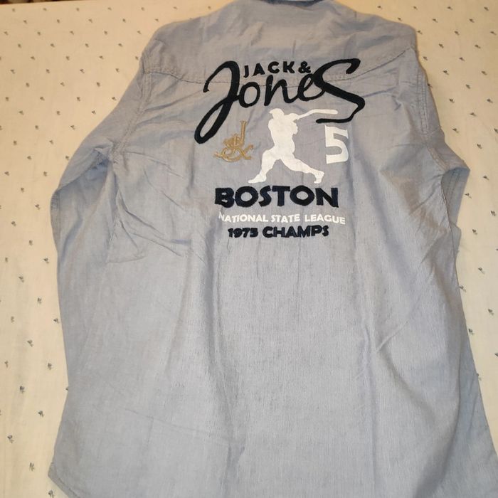 Chemise homme de couleur bleu clair lignée blanche avec dessin dans le dos . Marque jack&Jones. Taille :M En parfait état Maison non fumeur Possibilité de discuter