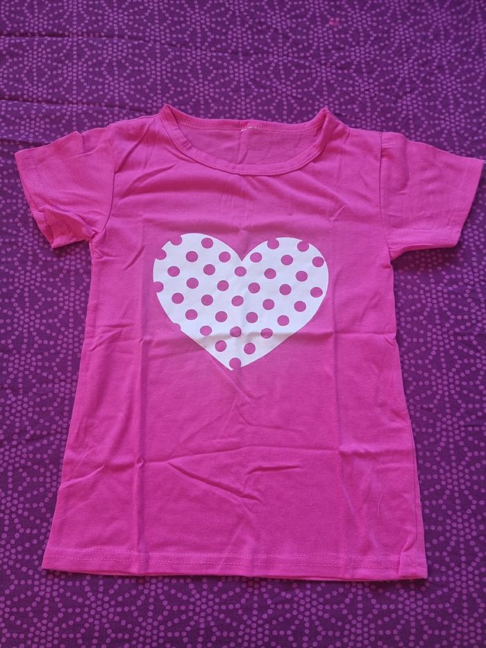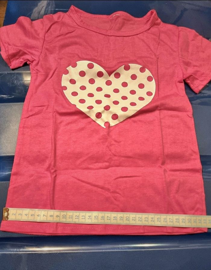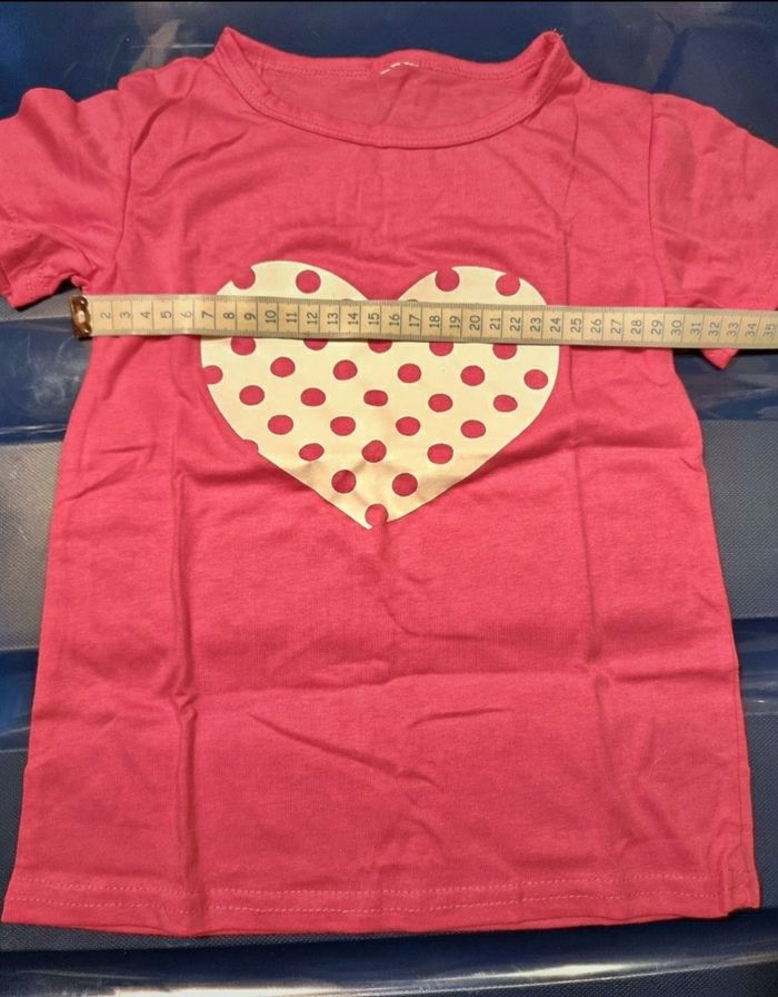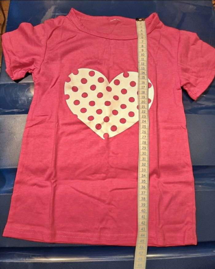 T shirt enfant 3-4 ans? 🌸💜😊😊Merci de me contacter avant tout achat car je suis souvent en déplacement afin d'être sur que je puisse envoyer le colis dans les temps. MERCI😊😊💜🌸 T shirt rose cœur 3-4 ans neuf avec coeur. Mesures sur la photo pour être sûr de la taille