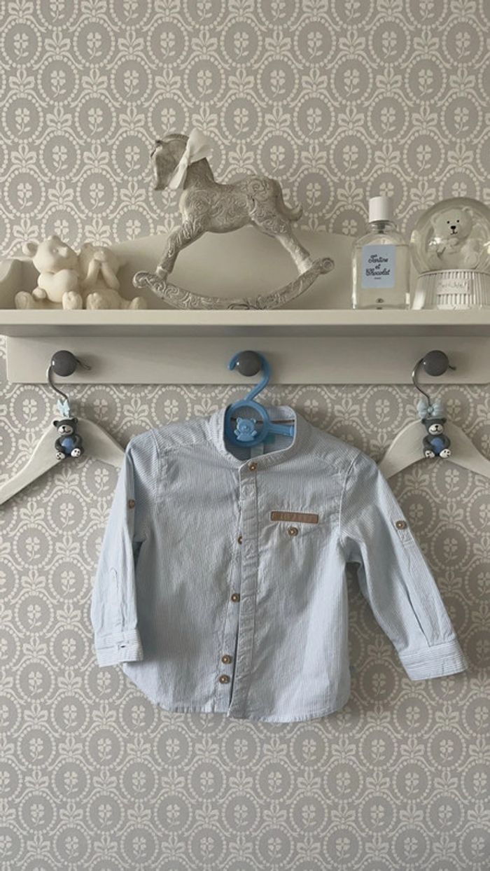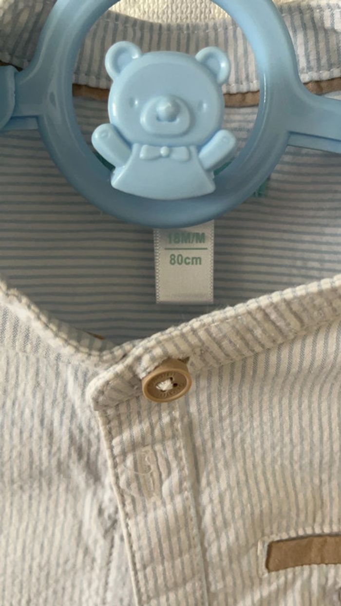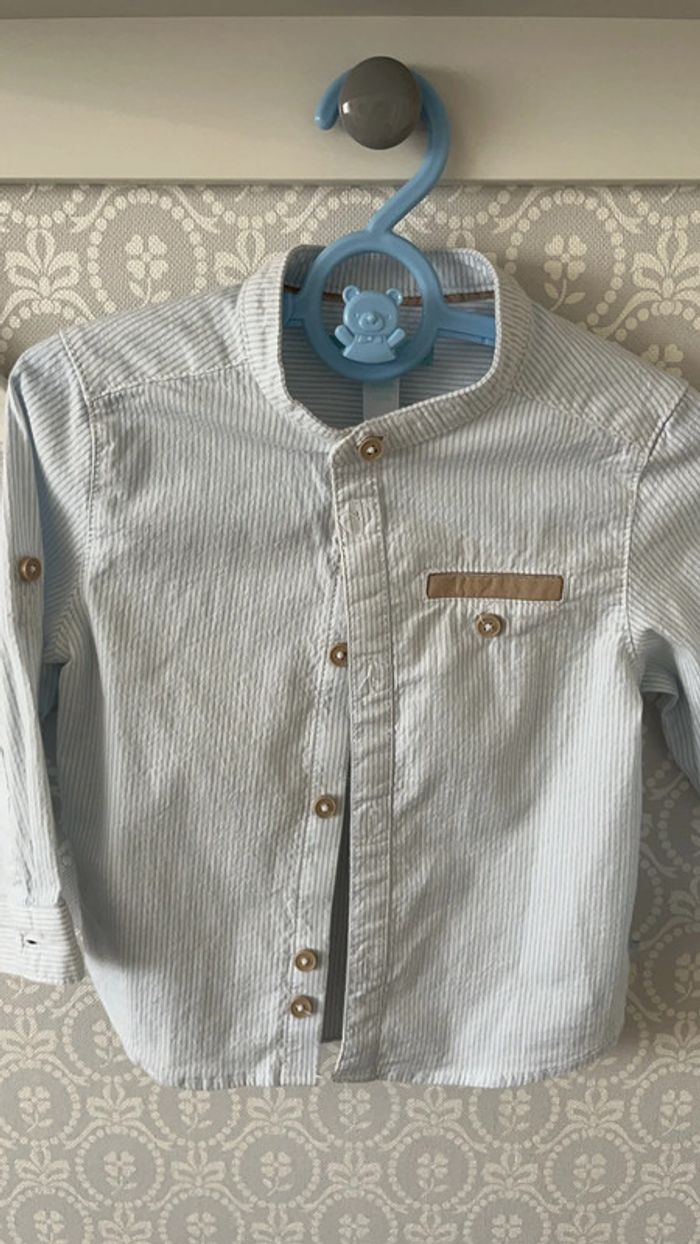 Chemise rayée bleu ciel Détail poche et bouton taupe beige Col Mao Obaibi Okaidi Taille 18 mois 80cm Parfait état
