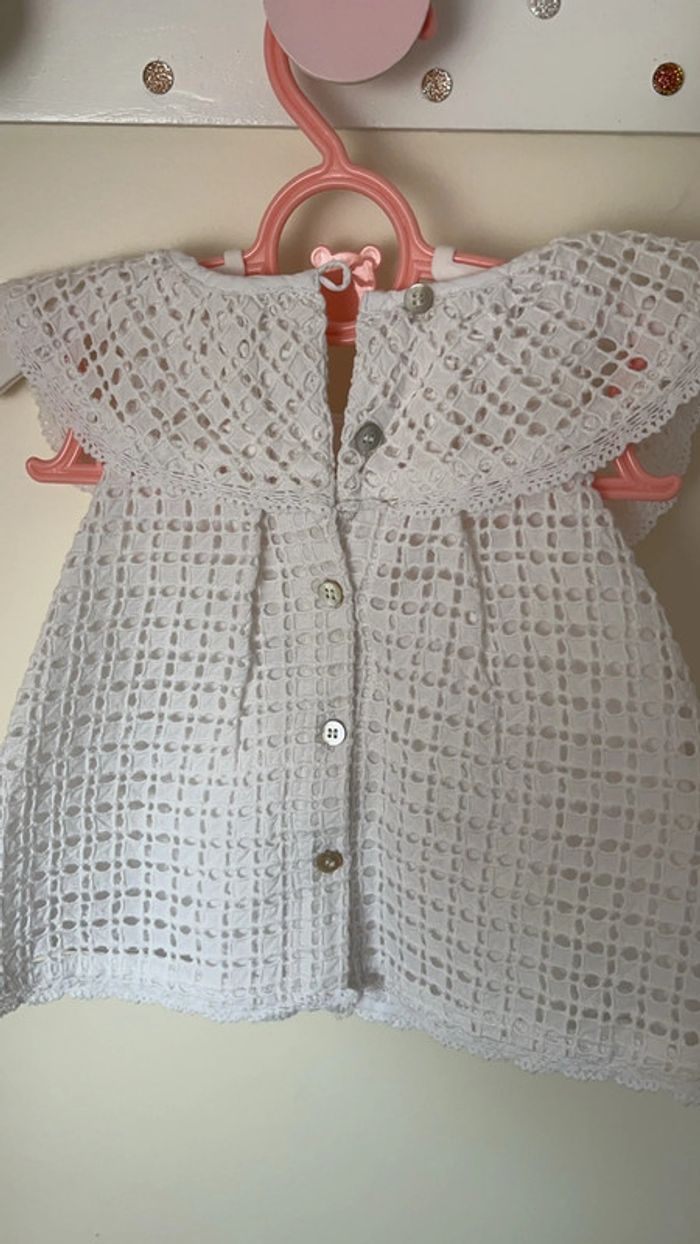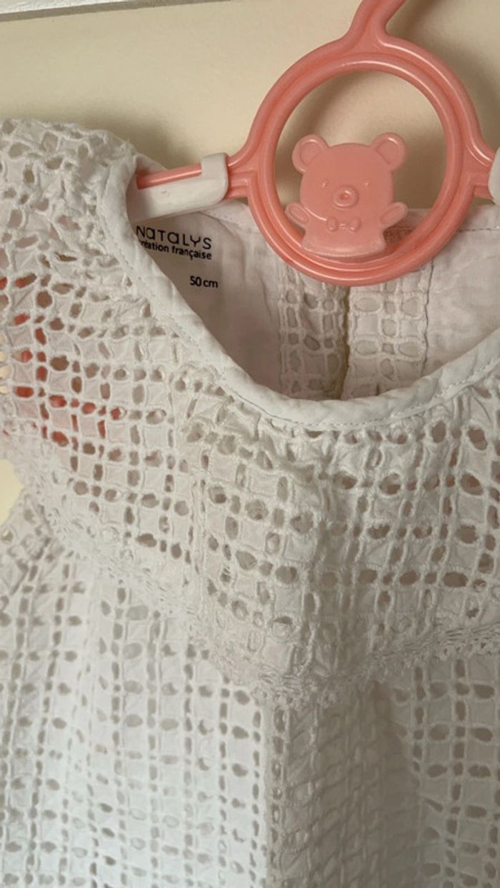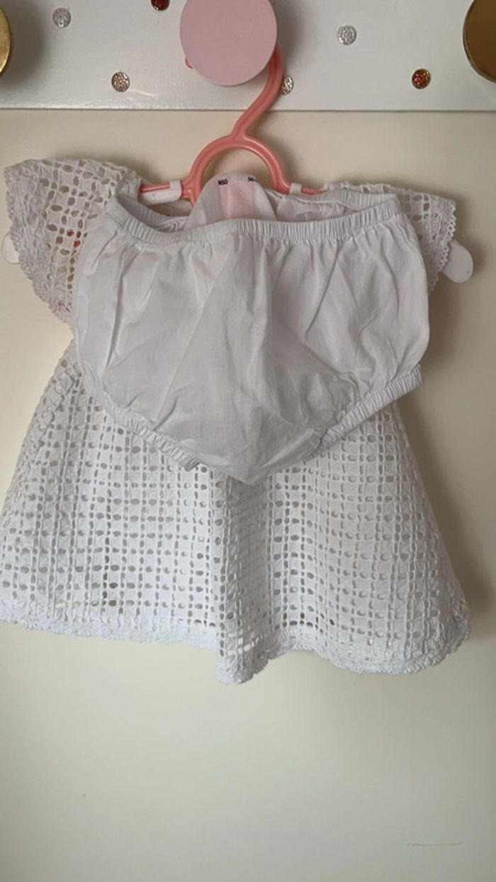 Robe dentelle crochet Avec bloomer cache couche Marque Natalys Taille naissance Coloris blanc Allait à un bébé de 3kg490 et 49cm
