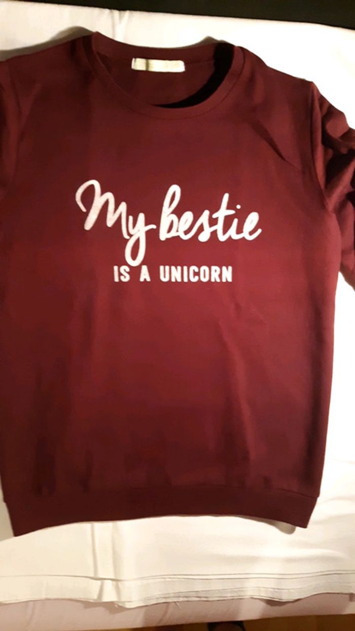 Je vends un sweat t-shirt bordeau avec des écritures blanches, à manches longues en 12 ans. Très bon état