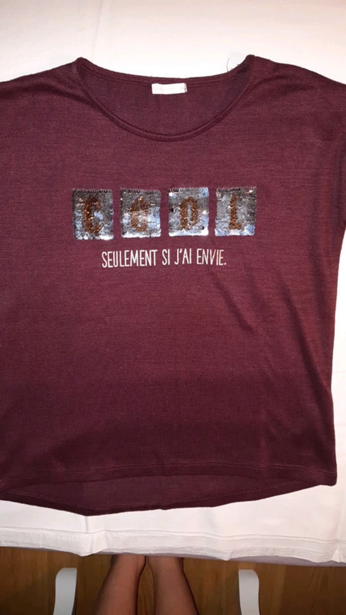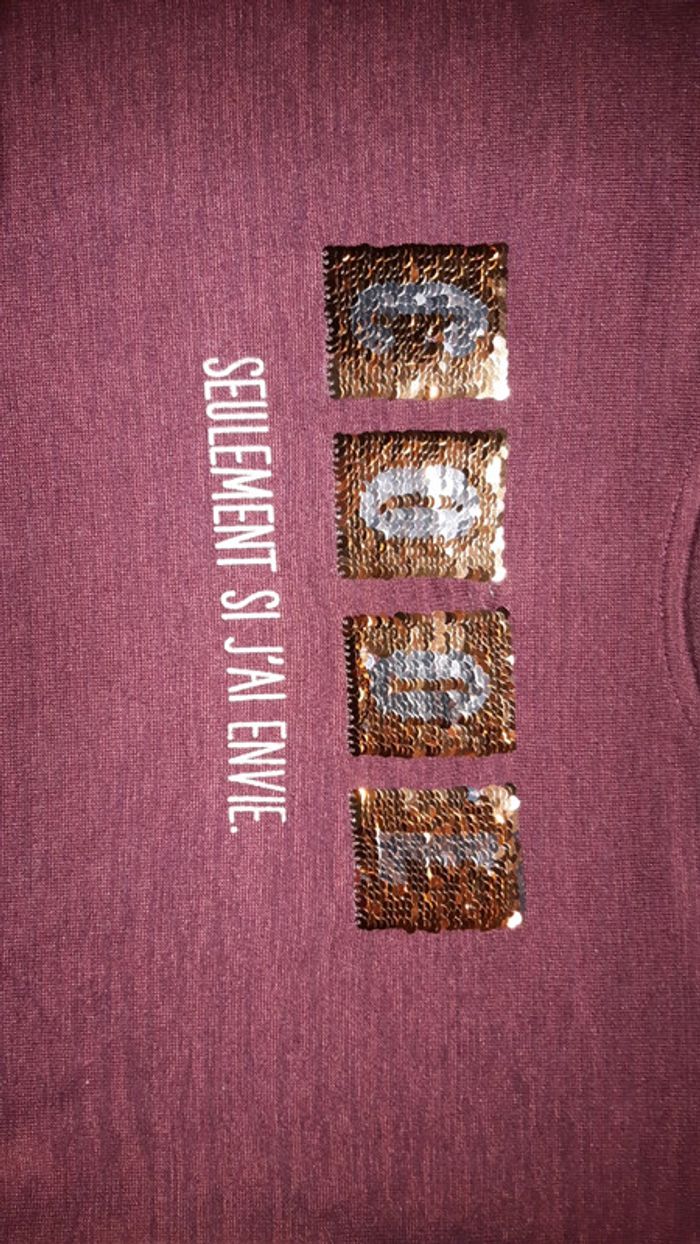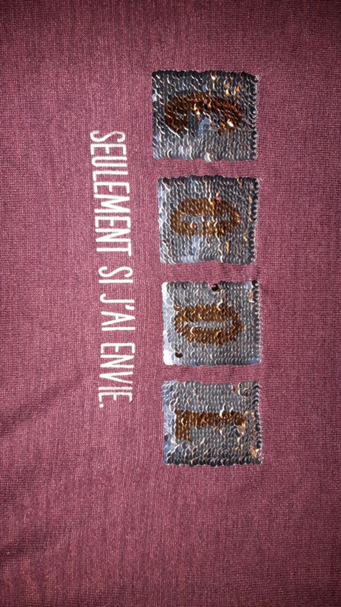 Je vends un t-shirt bordeau à manches longues pour fille en taille 12 ans. Écritures dorées et argentées en sequins. Très bon état