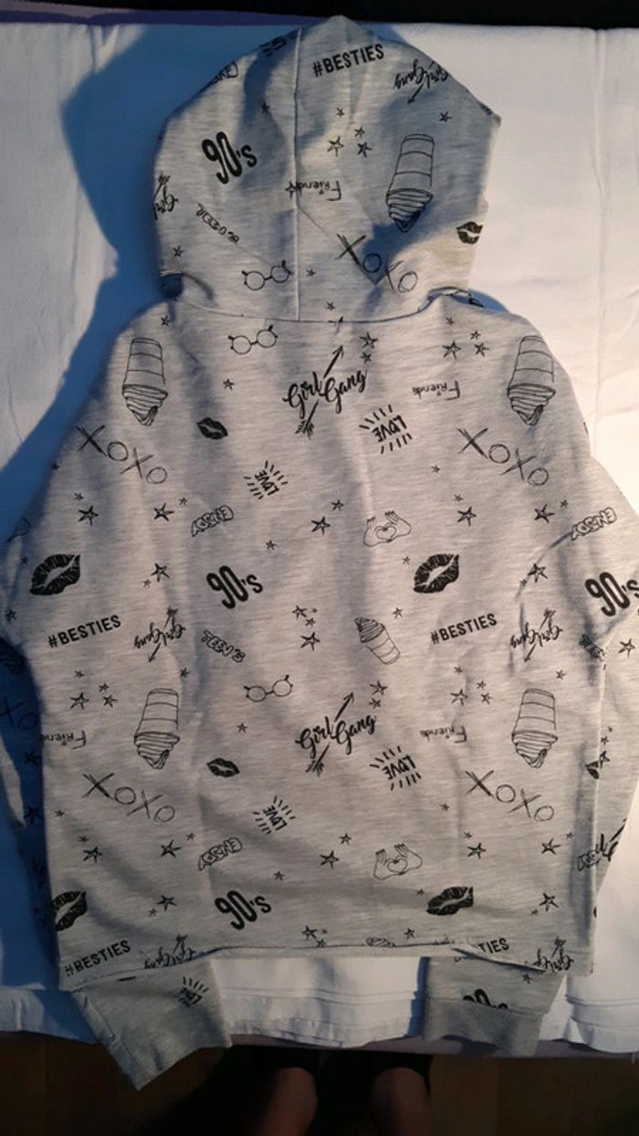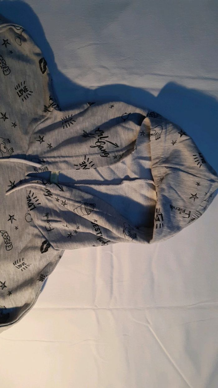 Je vends un sweat t-shirt gris clair avec des écritures noires à manches longues avec une capuche. Très bon état