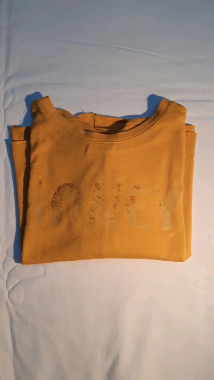 Je vends une t-shirt jaune moutarde pour fille en taille XS, vient de chez Gémo, il y a une écriture inscrite sur le devant "honey"