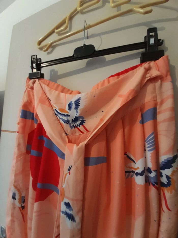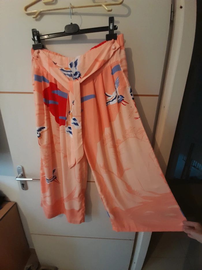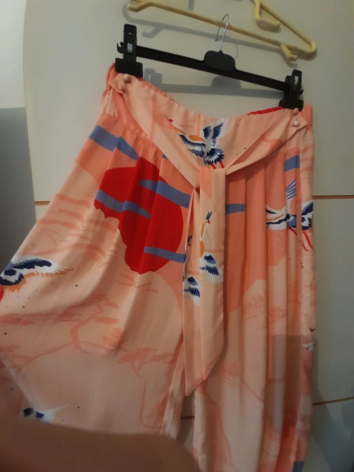 Pantalon à jambe large taille 38 très fluide Motif couché de soleil et oiseaux Peu Portée état neuf Plus de photo et informations sur demande Je ne fais pas d'envoi en dessous de 5€ d'achat Je ne fais ni retour ni remboursement Tout est visible sur les photos
