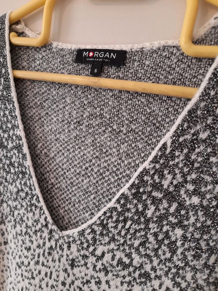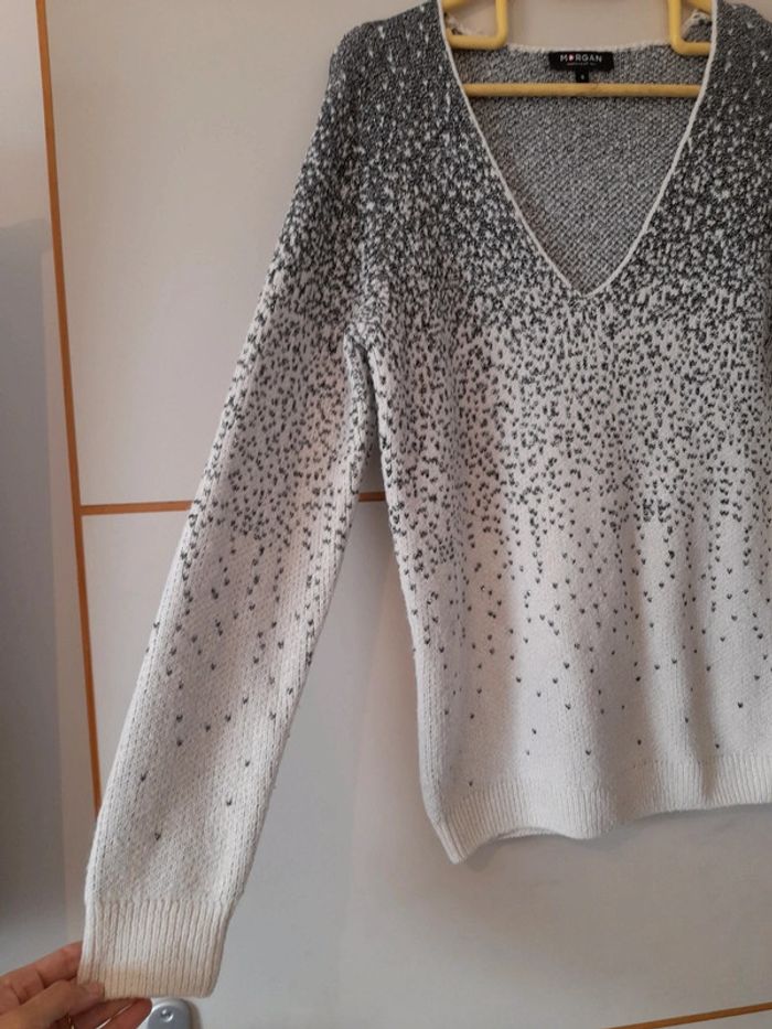 Pull taille S 36/38 col V Blanc et argenté brillant Prix d'achat 55€ Peu Portée reste en excellent état général Plus de photo et informations sur demande Je ne fais pas d'envoi en dessous de 5€ d'achat Je ne fais ni retour ni remboursement Tout est visible sur les photos Mini bouloche possible