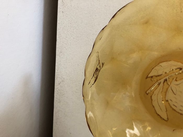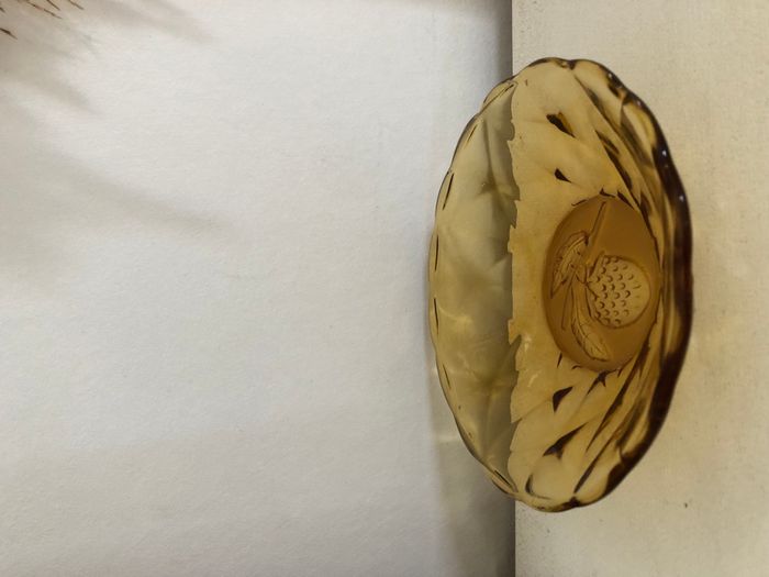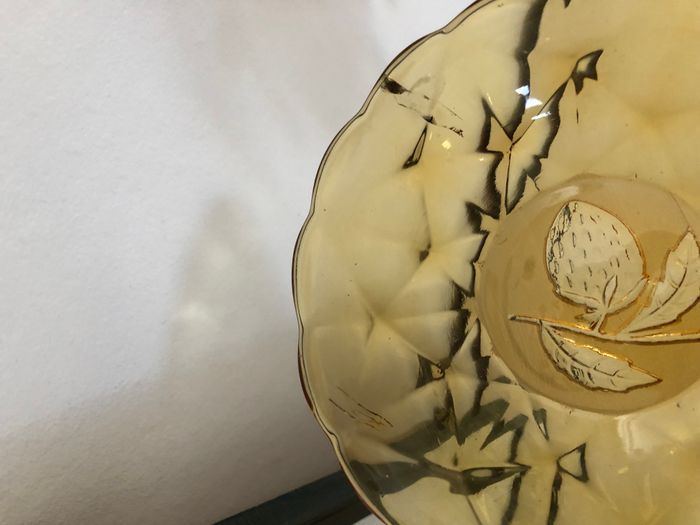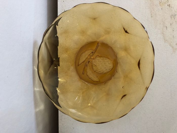 Vintage lot de 7 coupelles à fruit relief de fraise au font, jolie découpe en fleur couleur marron ambré En bon état: à noter des traces coulées dans le verre d'origine (ce ne sont pas des fêlures) et quelques bulles. Le seul éclat à peine visible est entouré sur l'une des photos. 12.5 cm de diamètre et 3 cm de hauteur