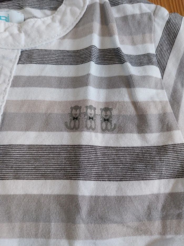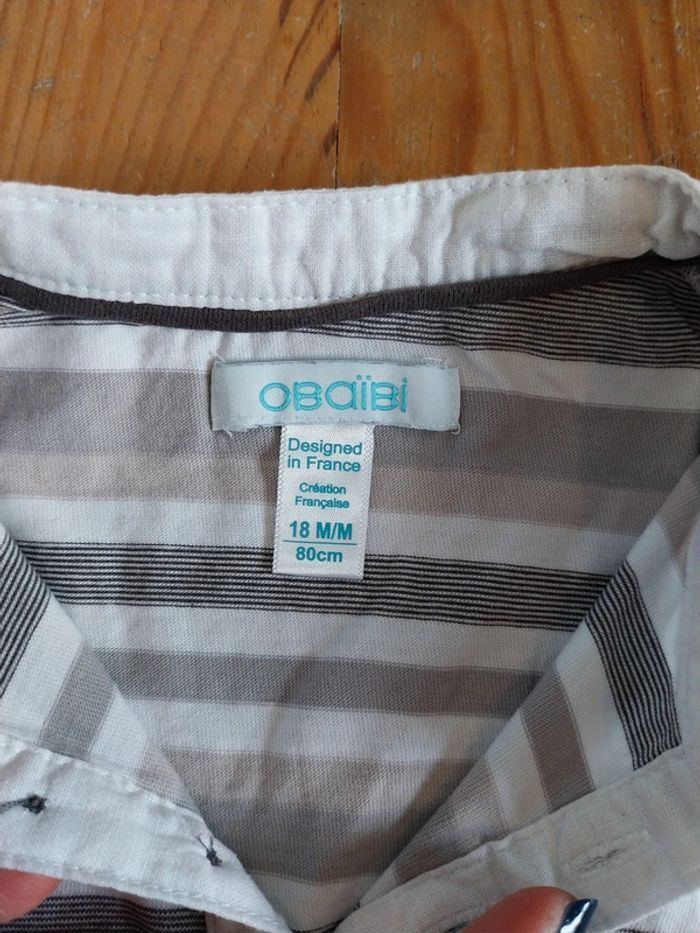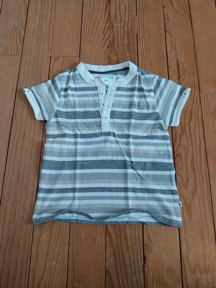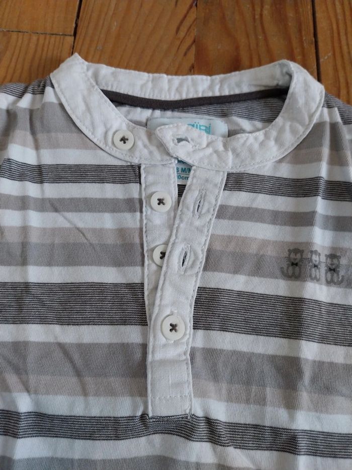 T-shirt manches courtes, rayé beige/marron/gris de la marque Obaibi. Très bon état. #mariesouc_garçon18mois #mariesouc_obaibi