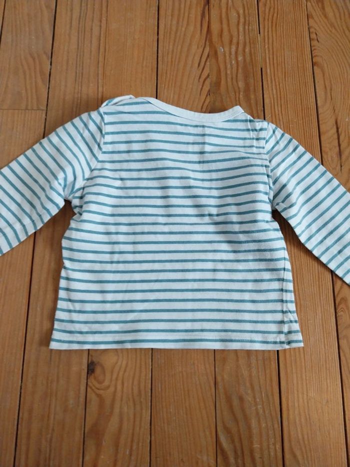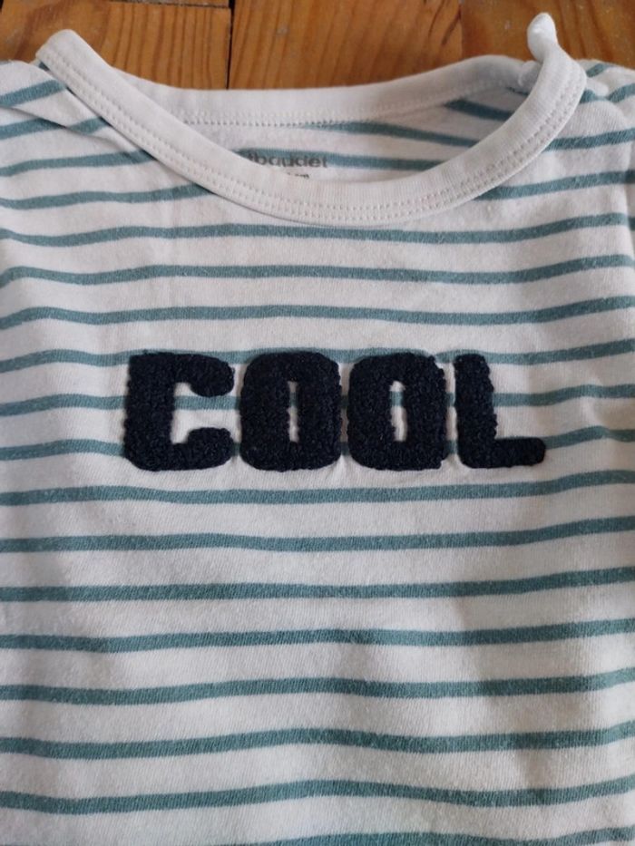 T-shirt rayé blanc/ turquoise a manches longues avec l'inscription "Cool" de la marque Vertbaudet. Très bon état. #mariesouc_garçon18mois #mariesouc_verbaudet