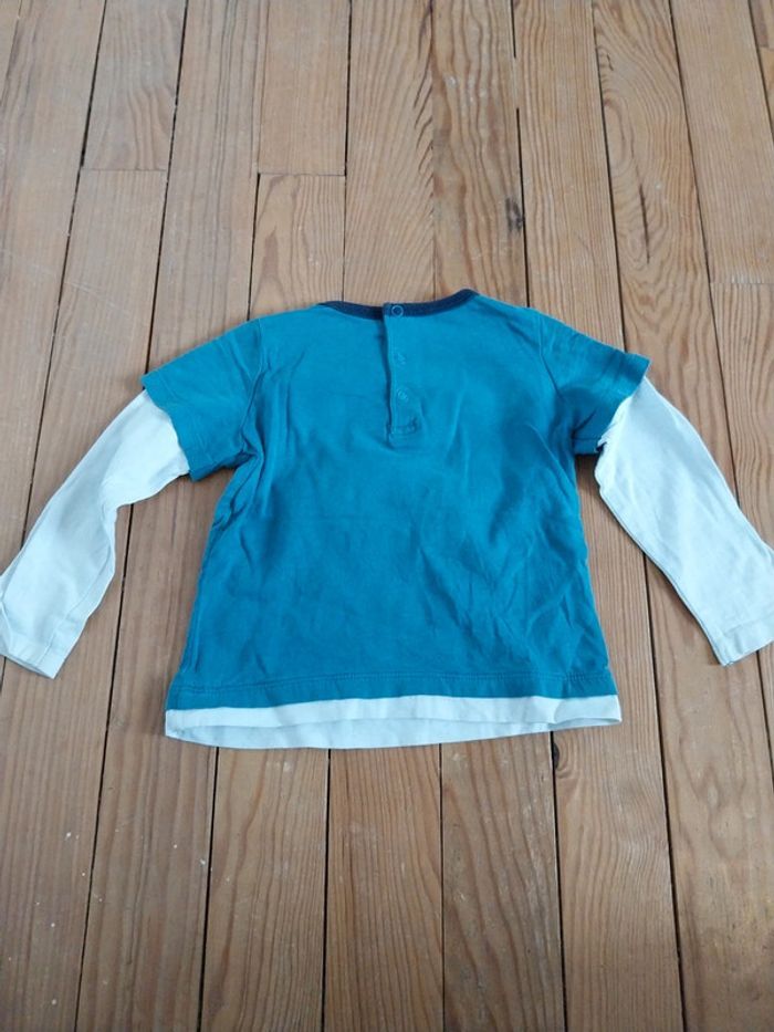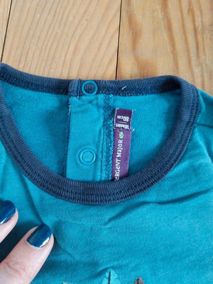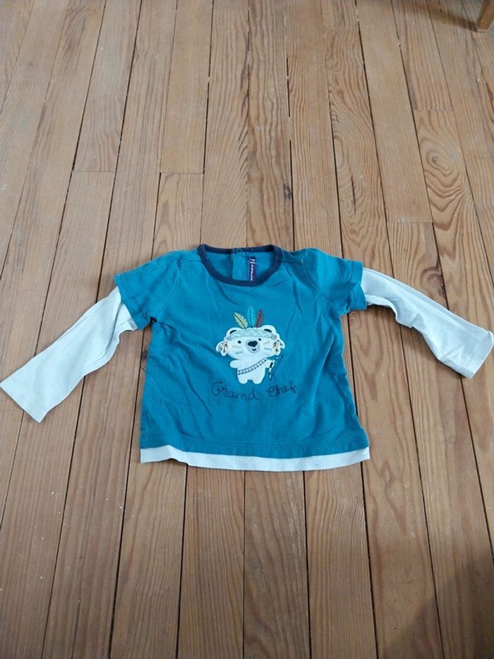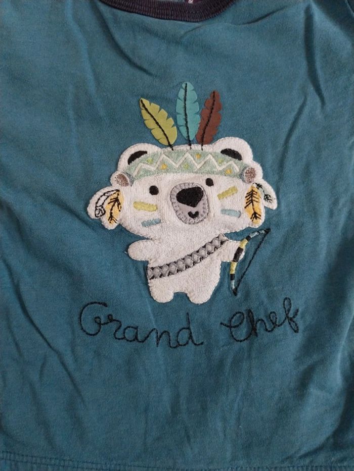 T-shirt manches longues de couleur bleu canard. Effet superposition de T-shirt. Inscription"grand chef" sur le devant. Marque Sergent major. Ouverture pressions dans le dos. Très bon état. #mariesouc_garçon18mois #mariesouc_sergentmajor