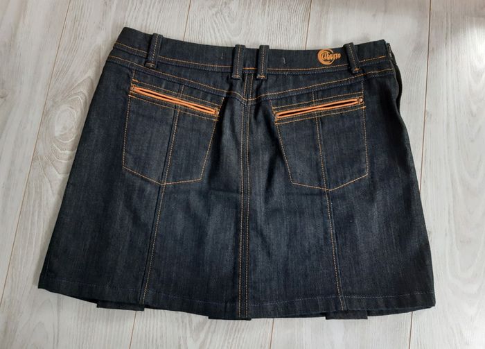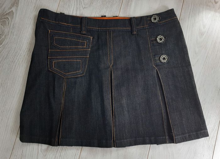 Jupe courte plissée Femme taille 40 Matière : jean Coloris : bleu marine, orange Marque : Liberto 3 poches Zippée sur côté gauche