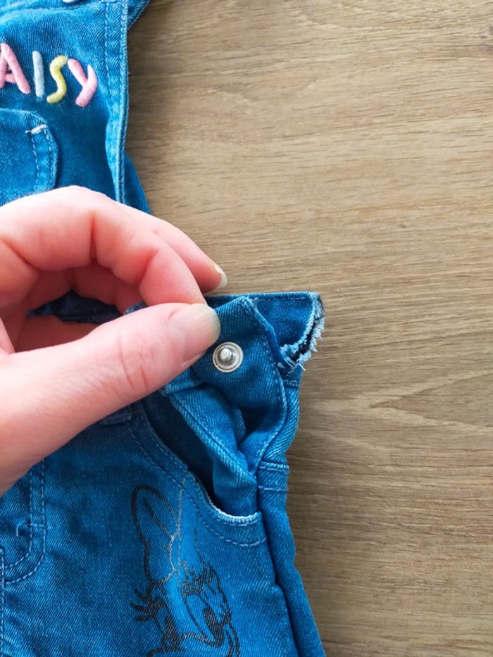 Salopette en jean fille taille 9mois Décousu comme indiqué sur photo, un point de retouche devrait suffir. Sinon excellent état