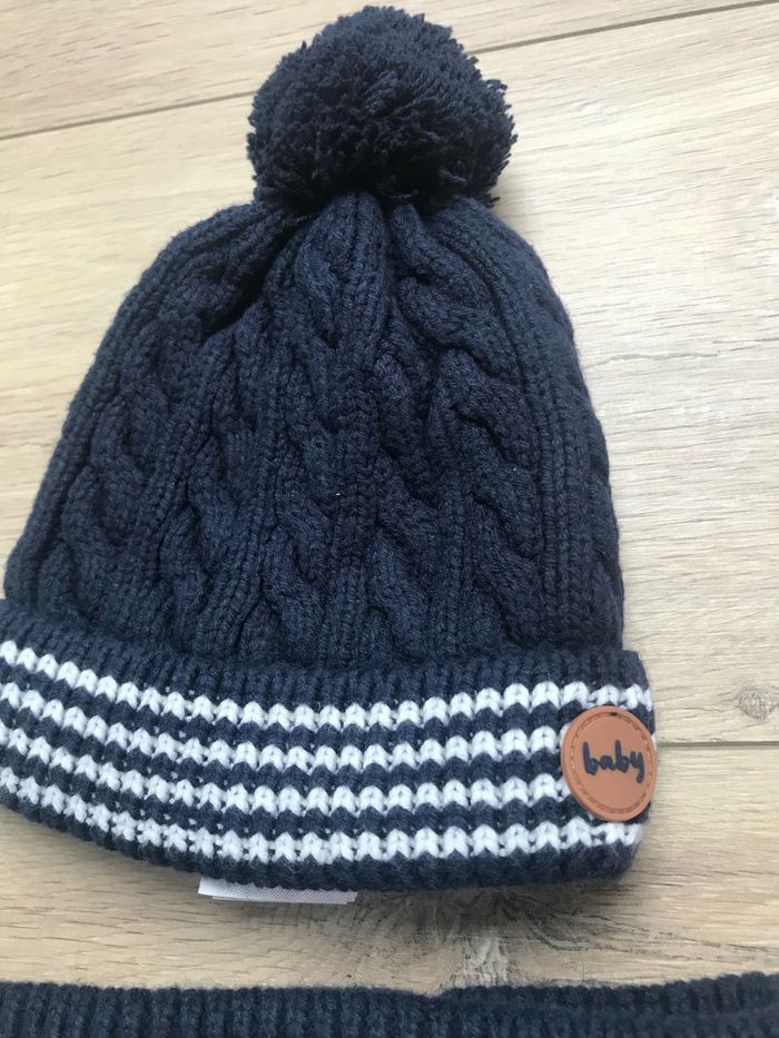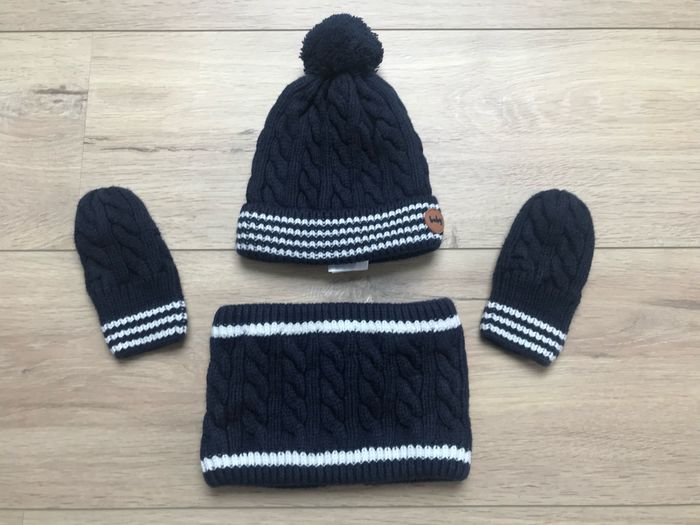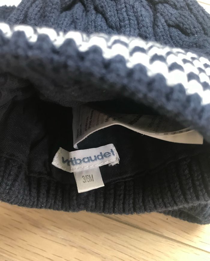 Ensemble bonnet tour de cou et moufles grosse maille marine à rayures blanches vertbaudet 3/6M