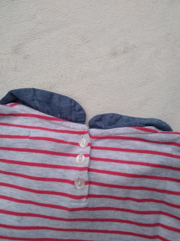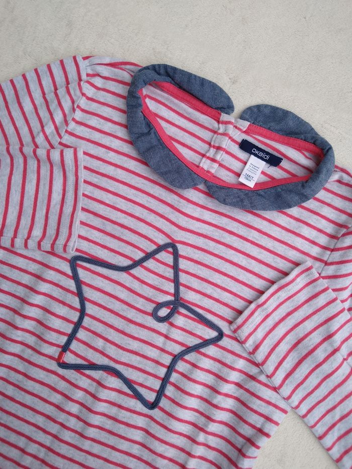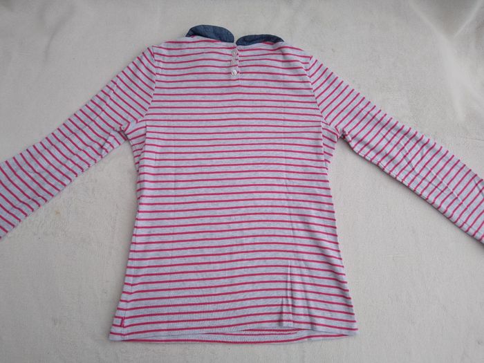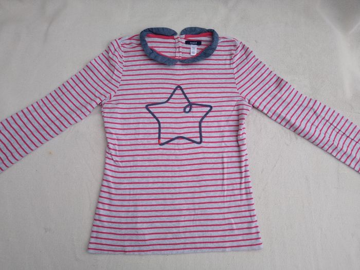 T-shirt à manches longues Marque Okaïdi Taille 14 ans, 158 cm • Coloris gris, rose, marine • Étoile brodée • Rayures horizontales • Col Claudine • Boutons au dos • Tissu fin, stretch En très bon état #evelyne_filles_14ans #evelyne_filles