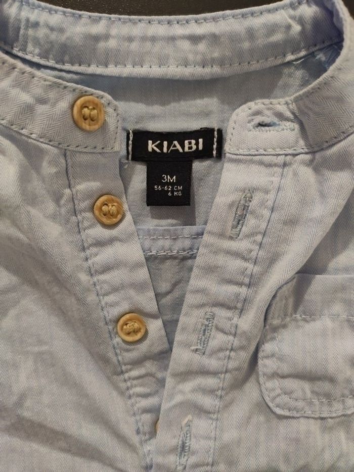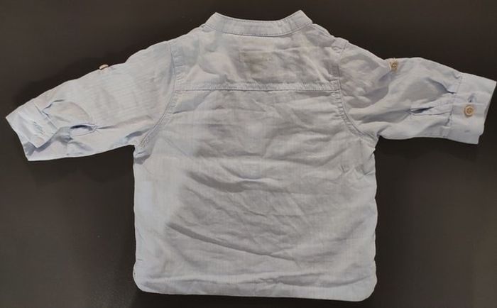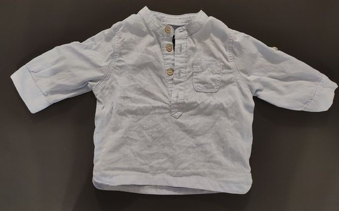 Chemise bleu ciel, les manches peuvent se retrousser grace a un bouton a l'intérieur de la manche. Marque: Kiabi Taille: 3 mois Porté une seul fois, donc très bon état. Lavé lessive bébé