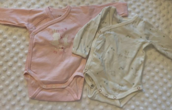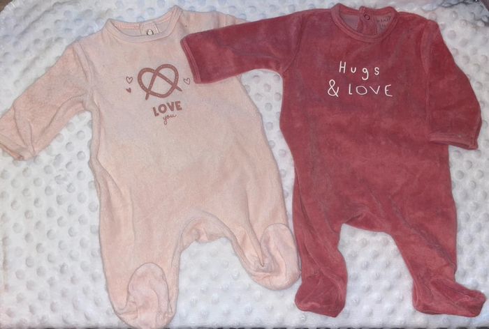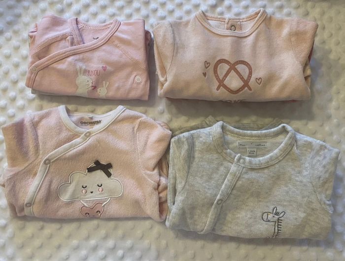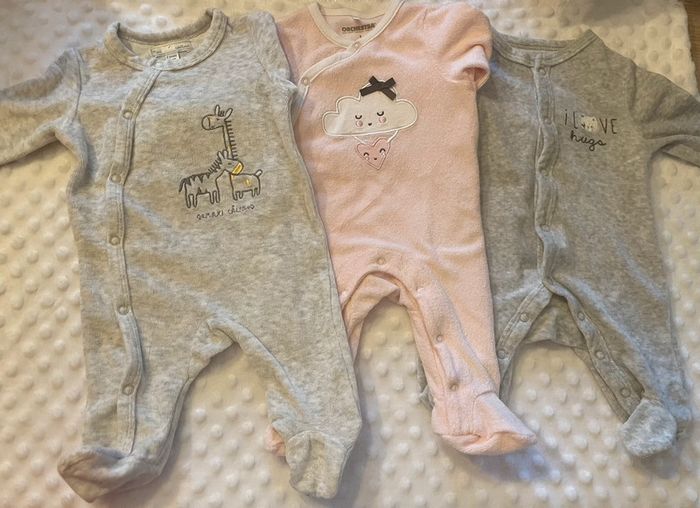 Lot comprenant : 5 pyjamas velours et 2 bodys manches longues. Taille 1 mois Multimarques : kiabi, orchestra, influx…