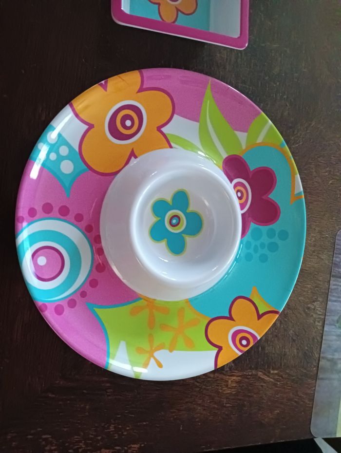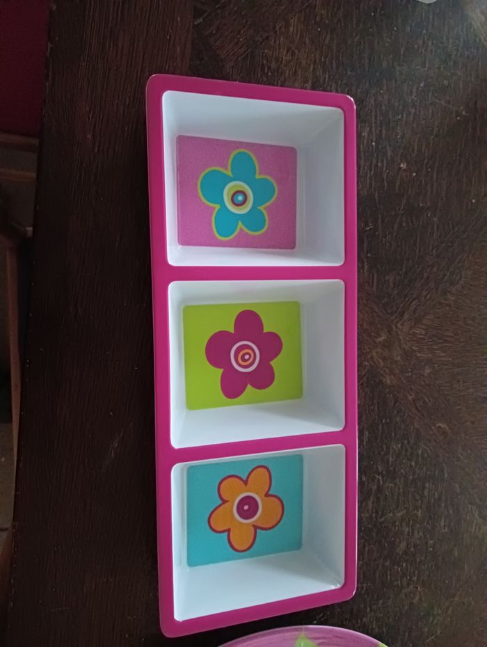Un plat en rond en excellent état Un plat rectangulaire avec trois compartiments un petit peu abîmés sur les côtés voir photos mais vraiment rien de méchant