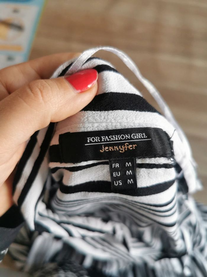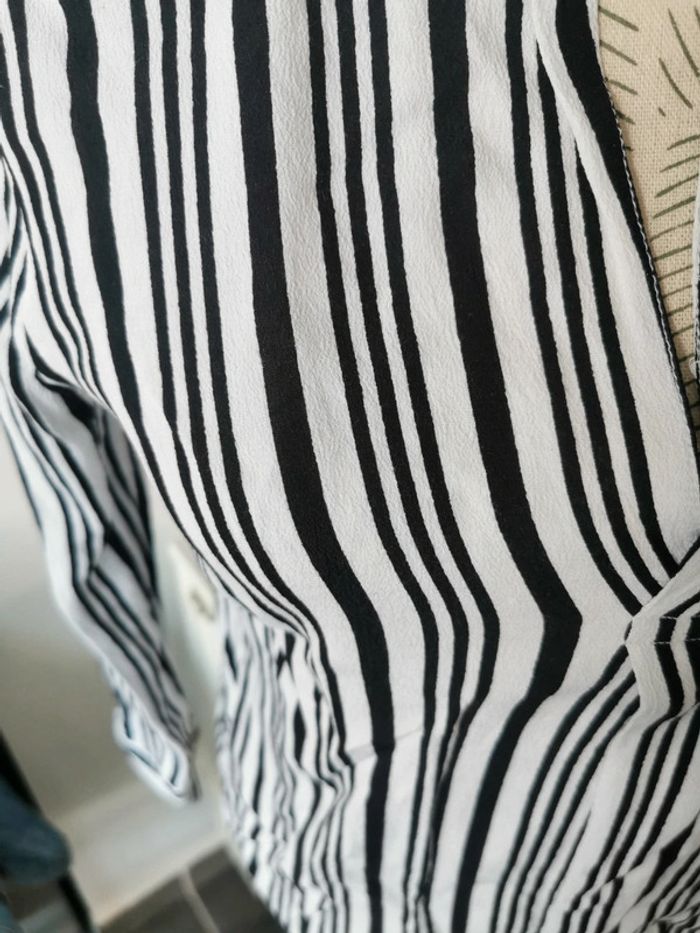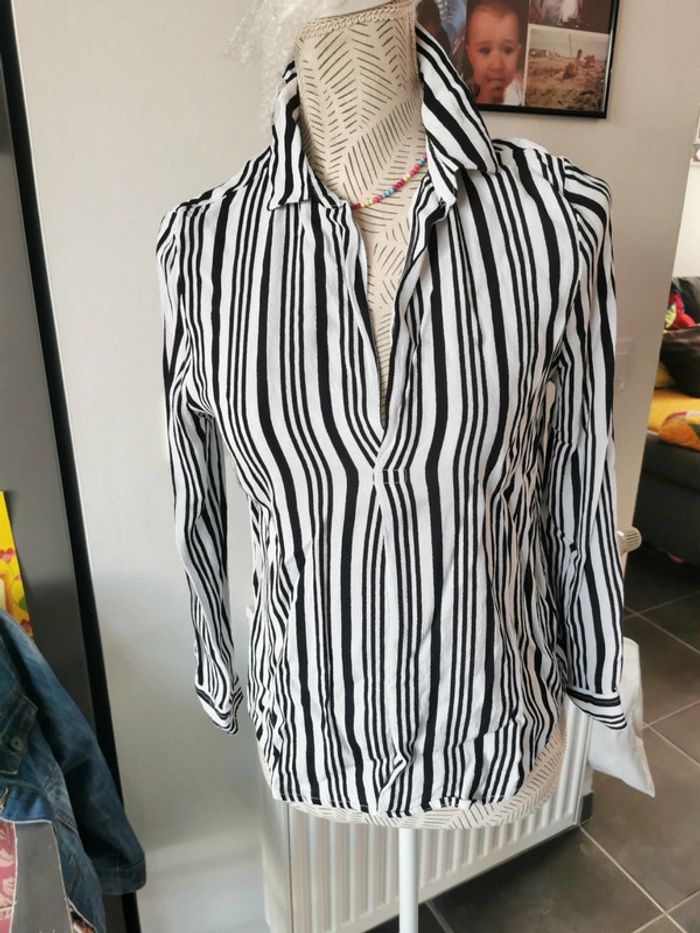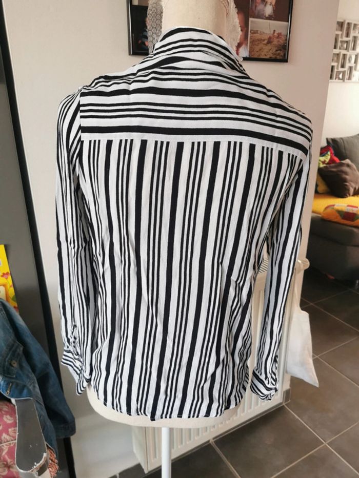 Très jolie blouse rayé noir et blanche 38 Col V Manches 3/4 et elles se révèlent avec une petite languette et un bouton Très bon état