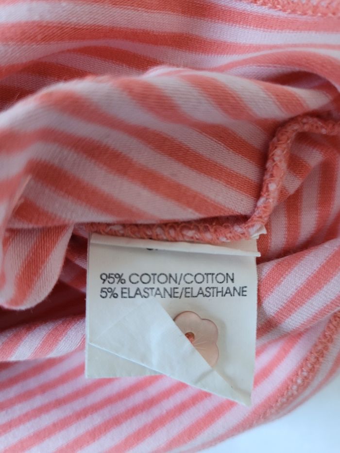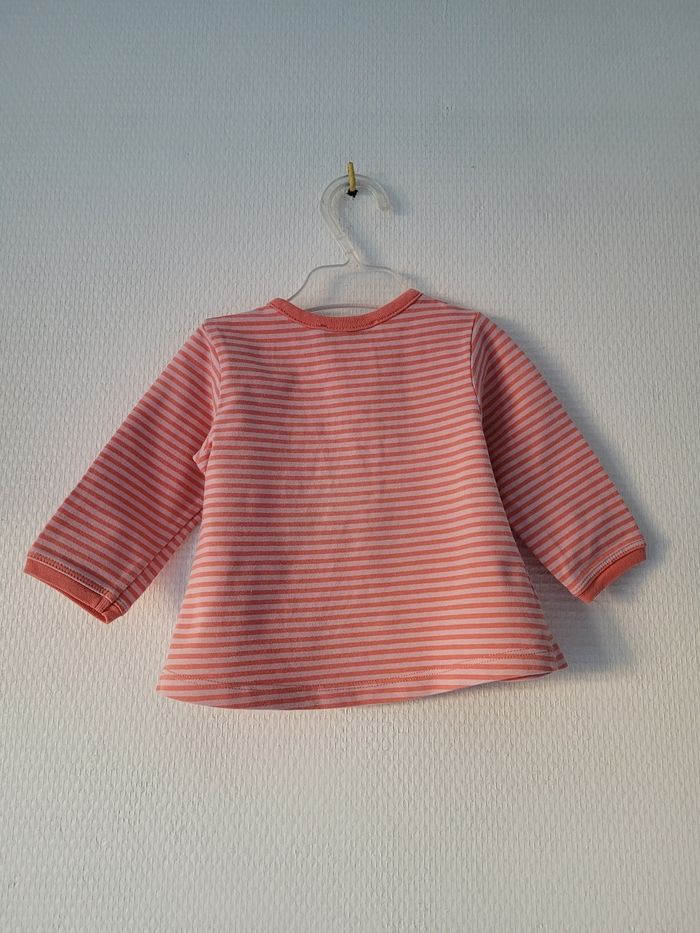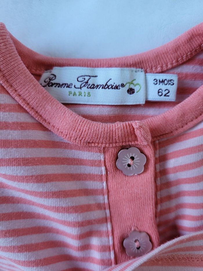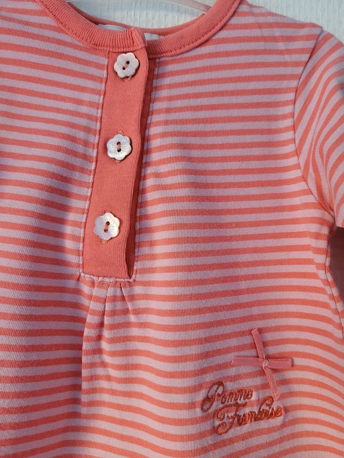 T-shirt rayé corail/saumon et rose pâle de marque Pomme Framboise taille 3 mois Jolis boutons Forme ample 95% coton / 5% elasthanne En très bon état