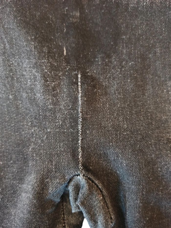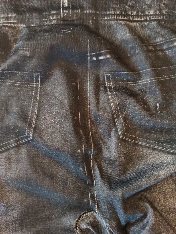 Legging imitation jean taille L - XL Effiloché un petit peu devant et derrière mais peut encore servir ne se voit pas avec un pull par-dessus voir photos ci-joint 94 % polyester 6 % élasthanne