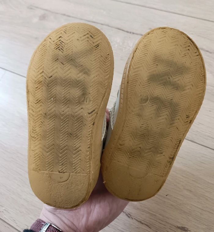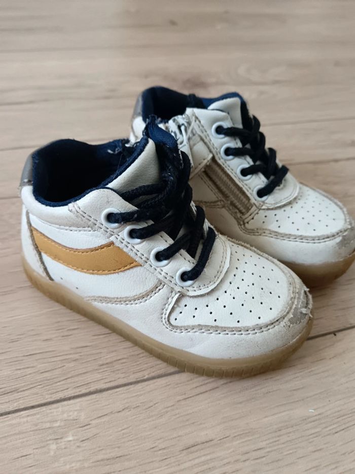 Basket blanche avec rayure jaune moutarde, abîmé sur le devant. Taille 20 Lacet bleu marine et fermeture sur le côté. Inscription New York dessous. Réduction sur les lots