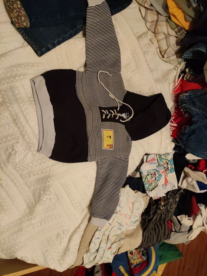 Lot de 6 articles 18/23 mois composé : 1 pantalon jean 1 salopette Jean bleu 1 salopette noire 1 pantalon velours marron 1 sweat a capuche 1 pantalon bleu marine 15 euros le lot