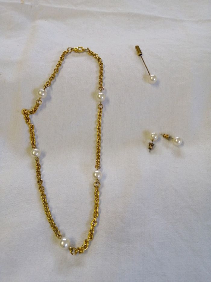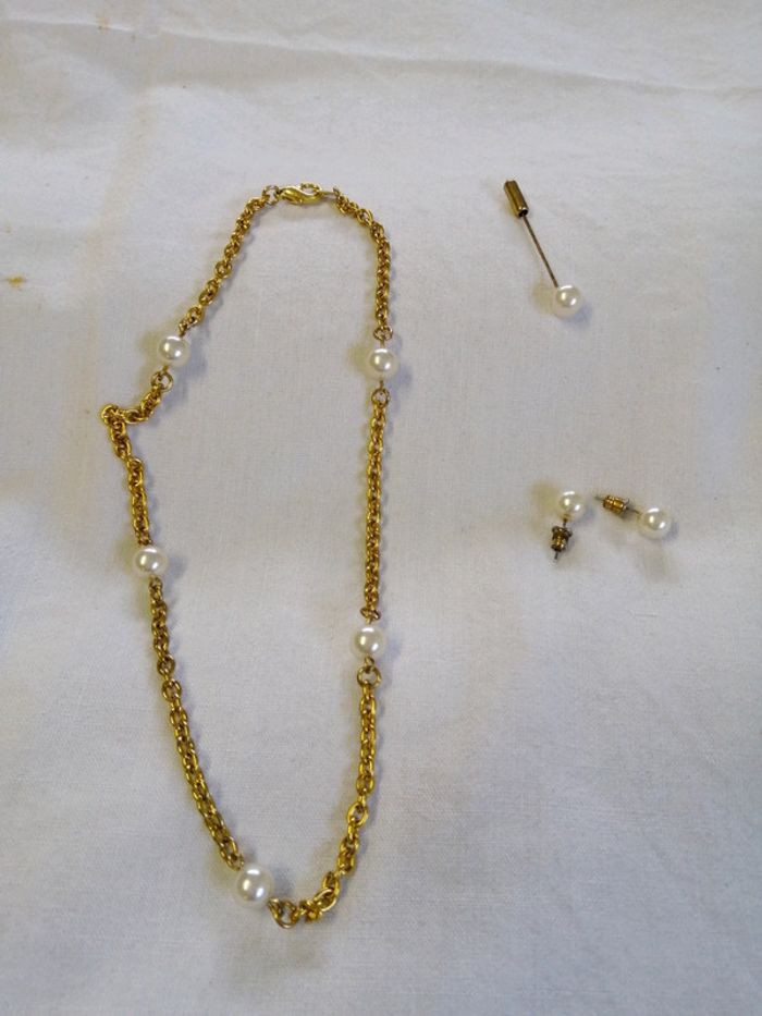 Ensemble collier boucle d oreille et broche doré et imitation perle de culture