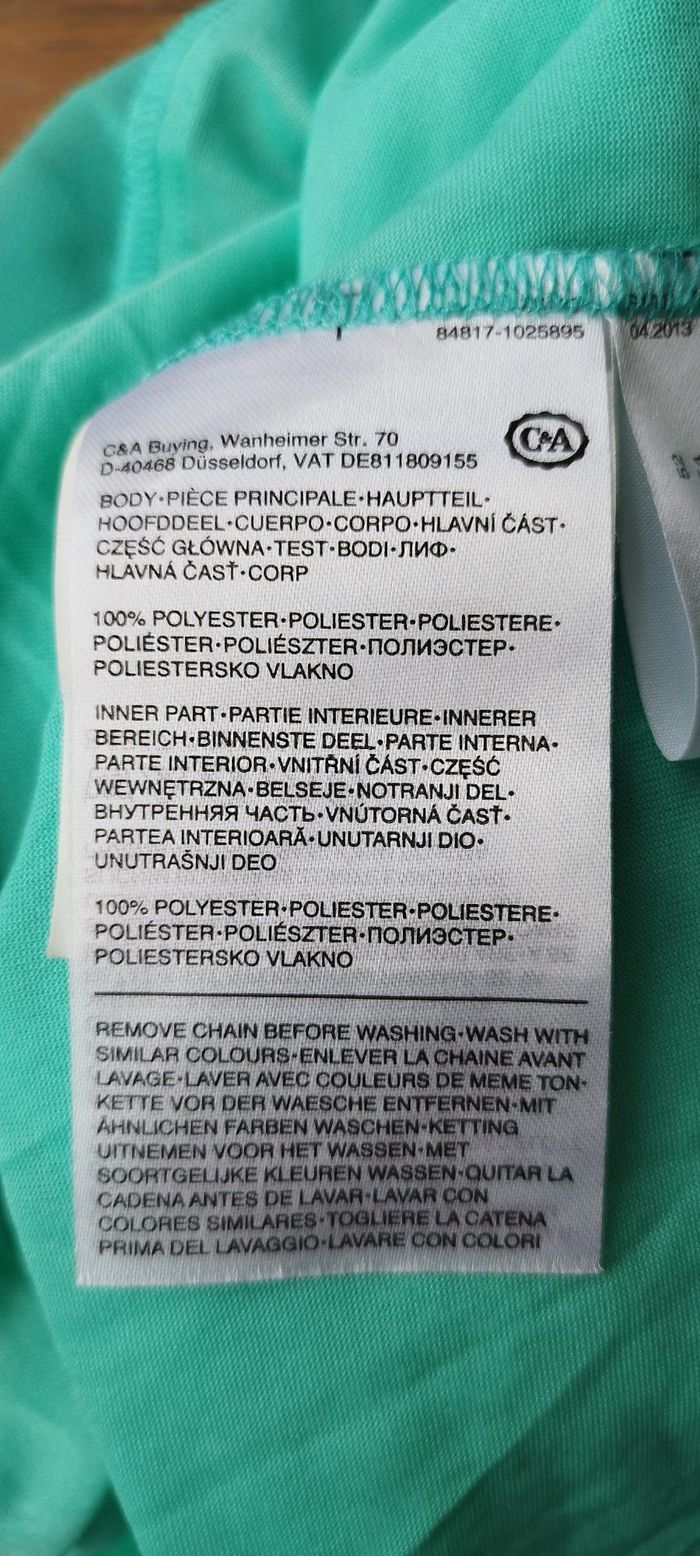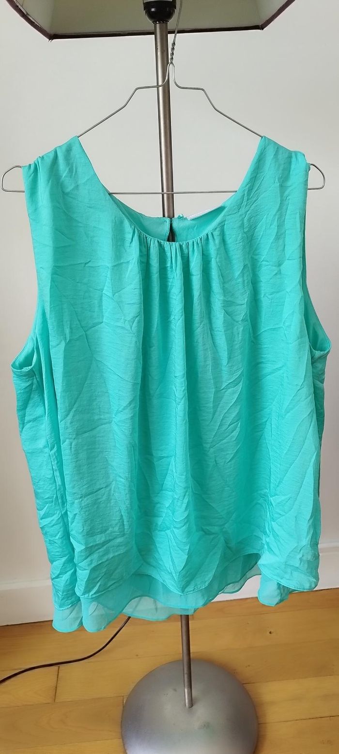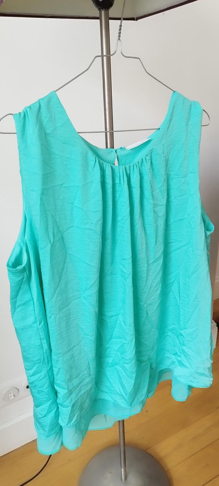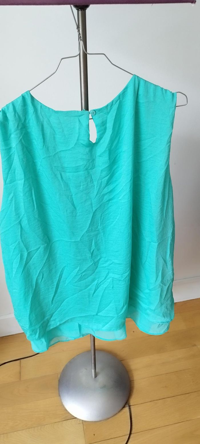 Débardeur fluide vert doublé de la marque C&A ( CANDA) Taille 54 Excellent état , comme neuf , jamais porté. Fermeture avec un petit bouton dans le haut du dos. Dimensions: Largeur aisselle à aisselle : 60 cm Hauteur totale : 72 cm Largeur épaule à épaule : 40 cm Matière : 100% polyester ( extérieur comme doublure intérieure)