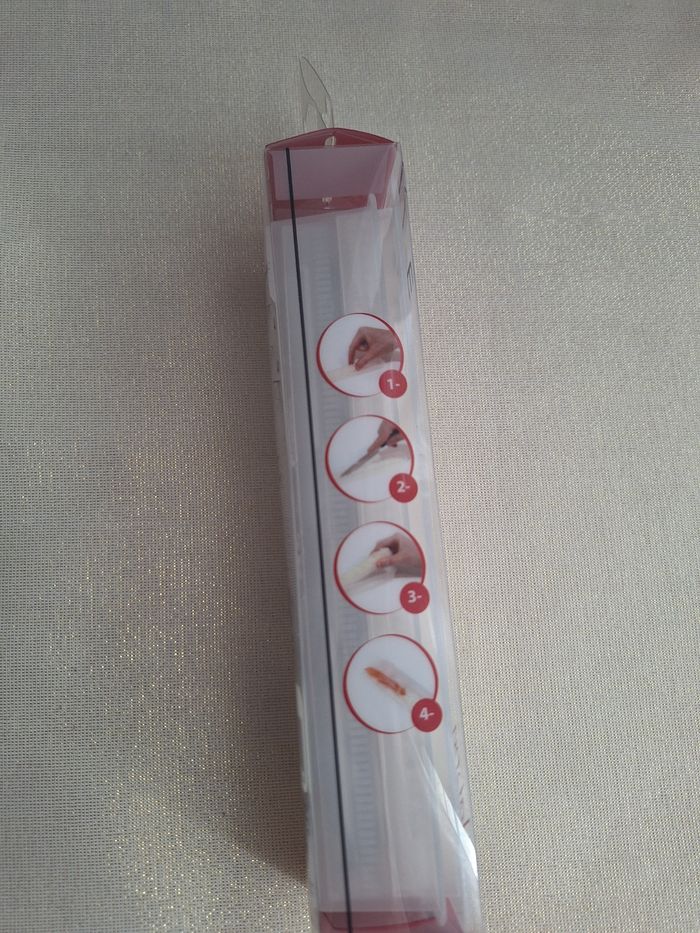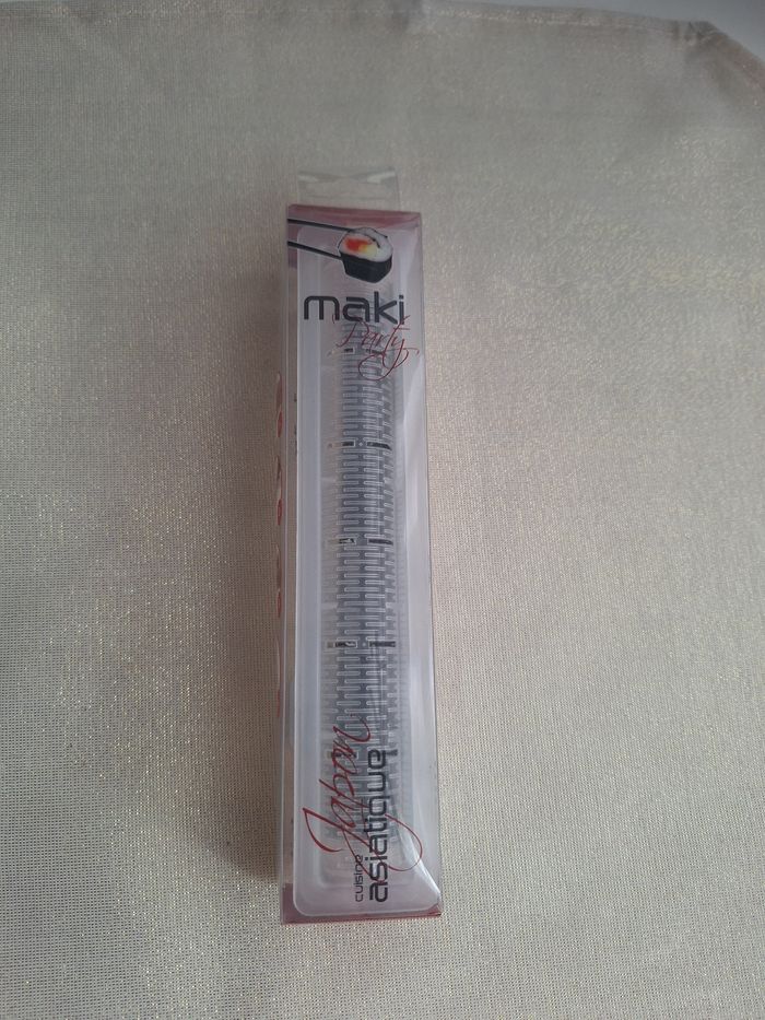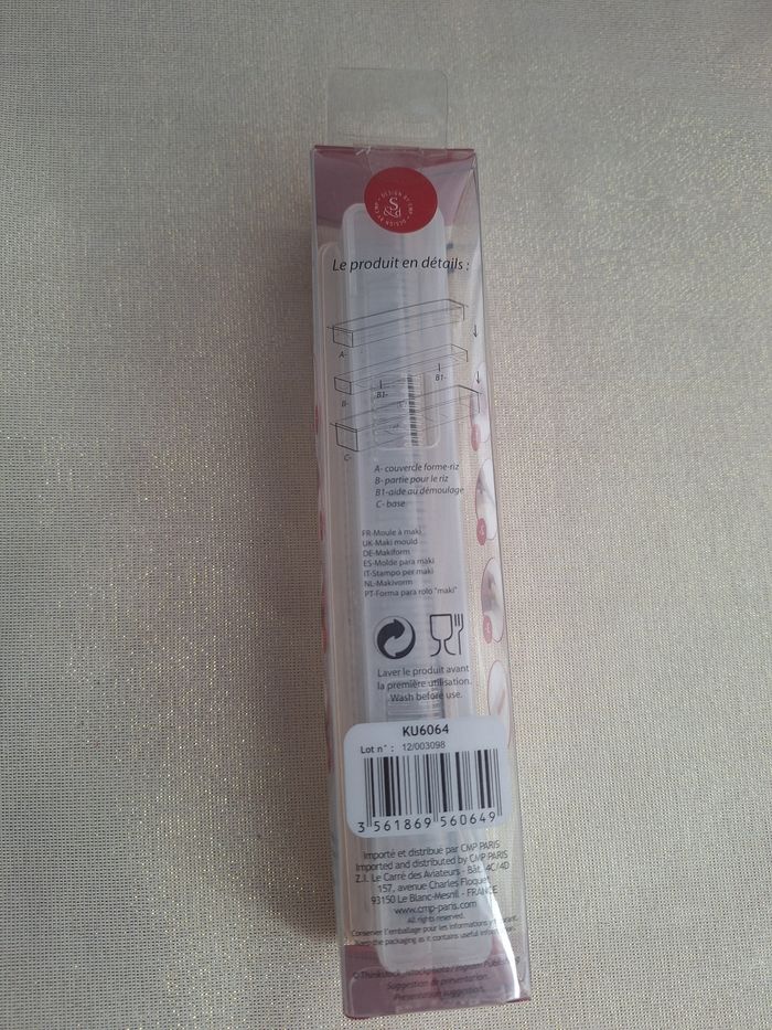 Bonjour ✴️Je vends ce kit/ moule à makis ✴️Mesurant 20x3x3,5cm ✴️Comprenant 3 parties : 1 base,1 partie pour le riz et 1 couvercle ✴️Passe au lave-vaisselle ✴️Marque CMP