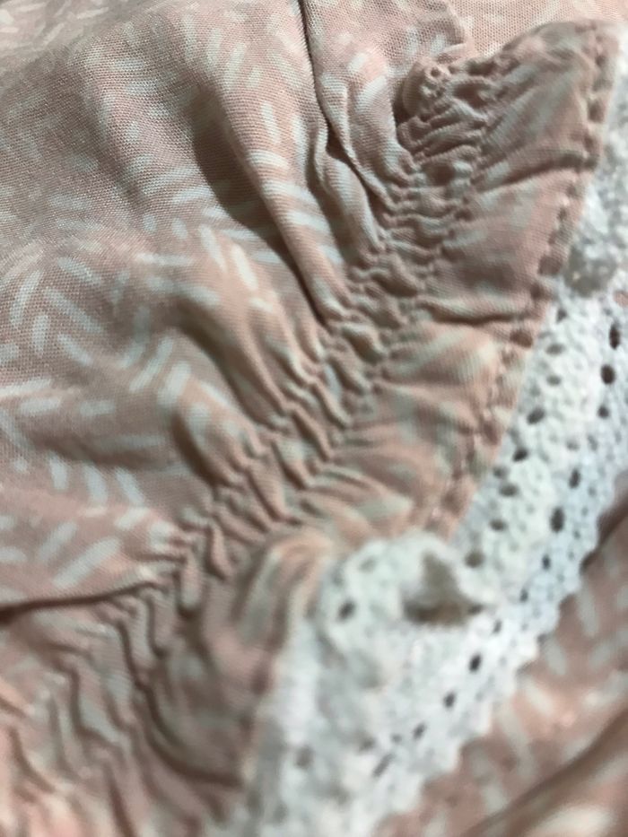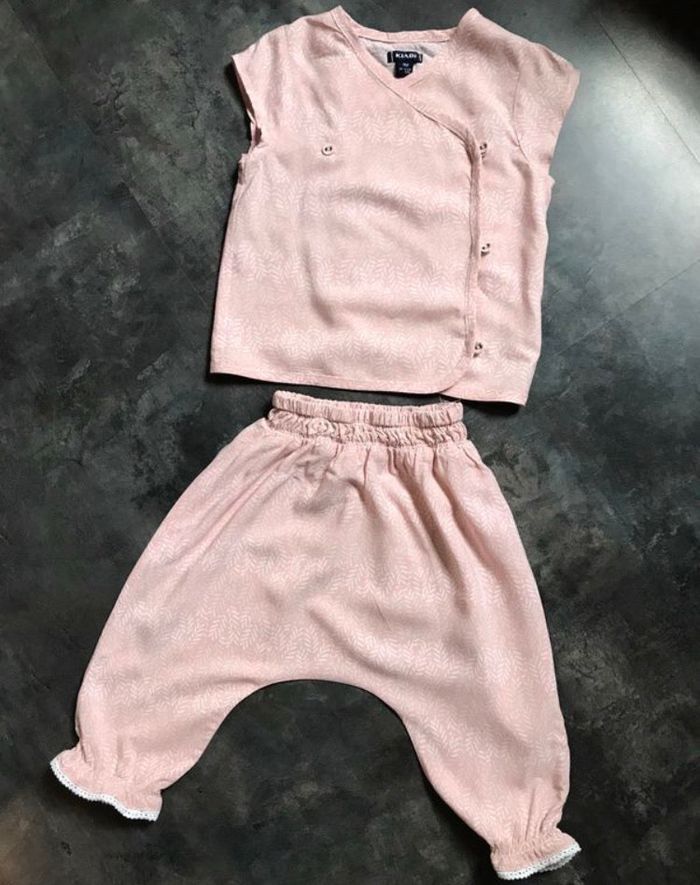 ensemble en tissus Léger très fluide rose poudré et blanc irisé comprenant un haut croisé devant, cache Coeur, 4 boutons recouverts du même tissu et un pantalon saroual avec dentelle en bas des jambes. Taille 9 mois / 69 à 72 cm. KIABI . Etat neuf. Tapez dans la loupe Jjzn9mois pour voir mes autres annonces dans la même taille