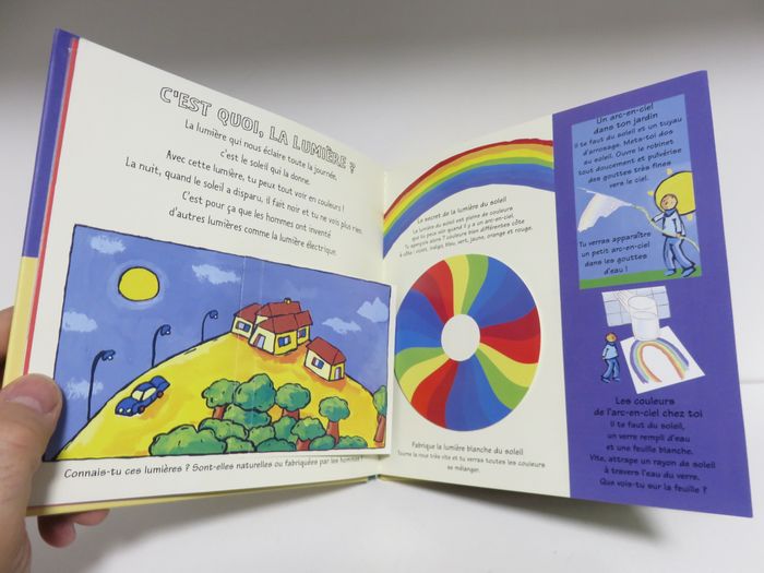 ⚠️ ÉTAT : Très bon état ⚠️ RÉSUMÉ : Une roue à tourner, des rabats à déplier, des livrets à feuilleter, une tirette à actionner pour comprendre le phénomène physique complexe de la lumière et ses couleurs ! Quelles sont les couleurs de l'arc-en-ciel ? Peut-on voir les couleurs, la nuit ? Que se passe-t-il si on mélange du jaune et du rouge ? Pourquoi certains animaux changent-ils de couleur ? Comment les peintres fabriquent-ils leurs couleurs ? 📦 LIVRAISON : Envoi ou remise en main propre sur Lyon