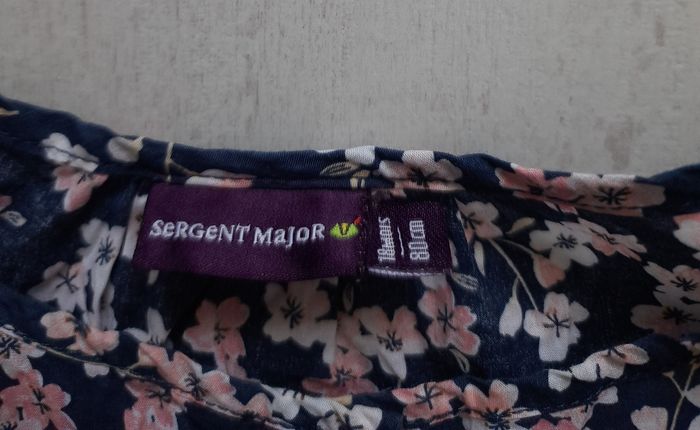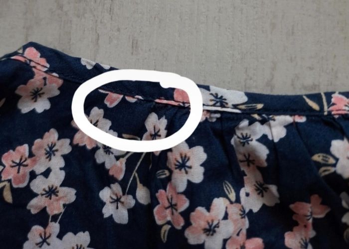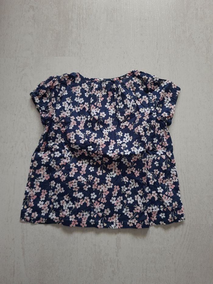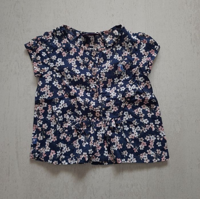 Très jolie blouse fine taille 18 mois 80cm. Manches courtes légèrement élastiquées. Motifs fleurs et 2 petits nœuds dans le bas. Écusson oiseau. 1 toute petite marque "d'usure" derrière au niveau du col très très peu visible (voir dernière photo). Reste en très bon état.