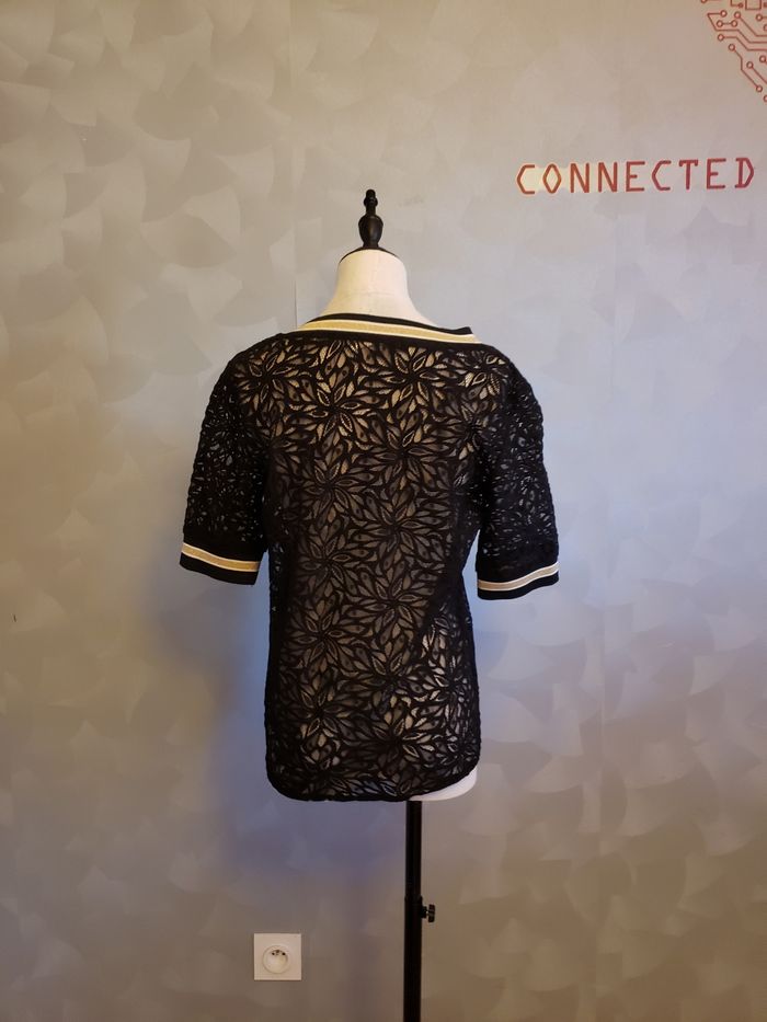 Teeshirt 🎀 en parfait état Couleur : noir, or et blanc Dentelle, détails aux manches et col (voir photos 1 et 4) Taille du mannequin : poitrine = 88cm, taille = 64cm, hanches = 83cm ⛔ Pas de photo porté ⛔ D'autres vêtements femme taille S : #clemencecavalierifemmeS