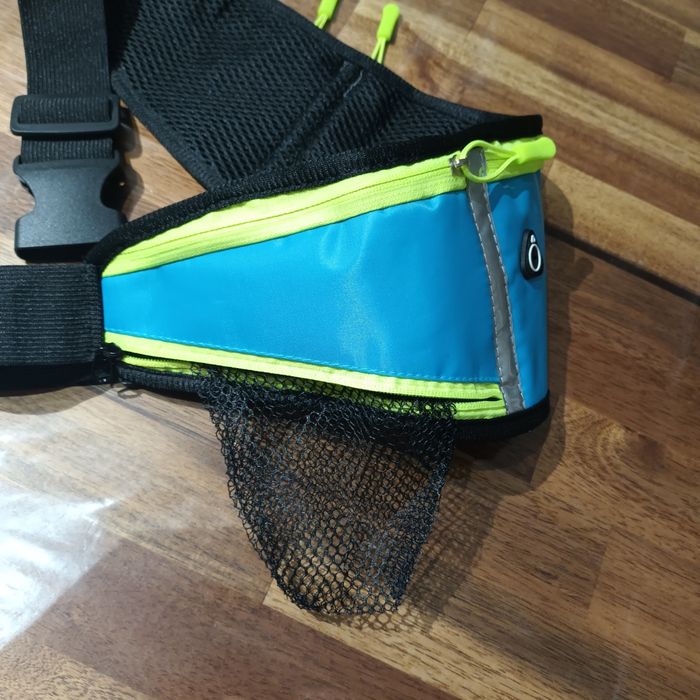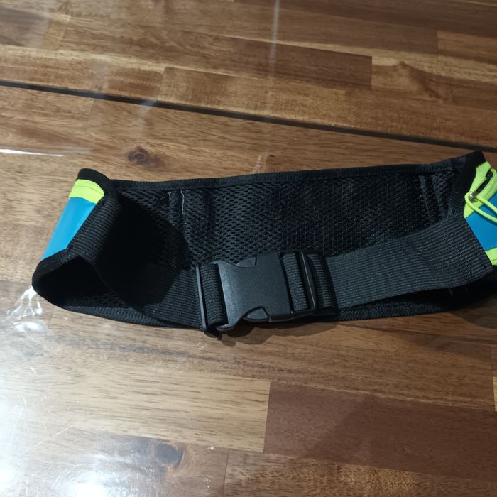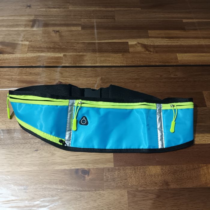 Petite banane bleue neuve. Elle est très légère et a 3 poches dont une qui s'ouvre en bas pour déployer la poche. Jamais utilisée sac