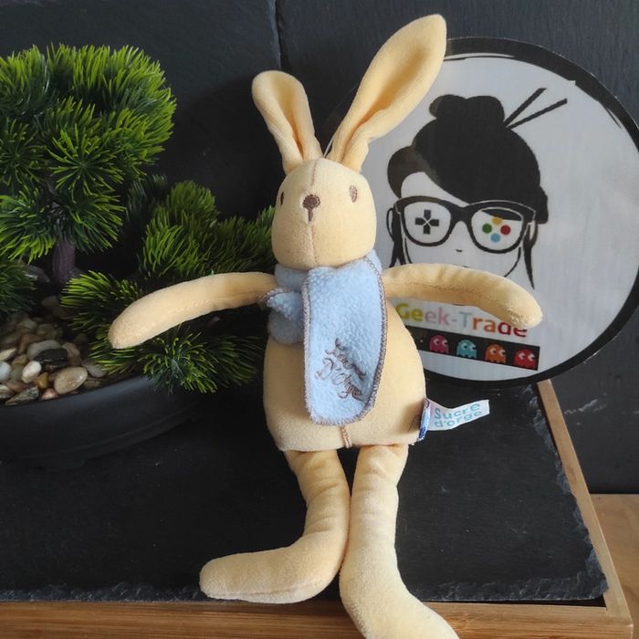 Doudou Peluche Poupee Sucre D'orge Lapin Jaune Beige Écharpe Bleu - photo numéro 1