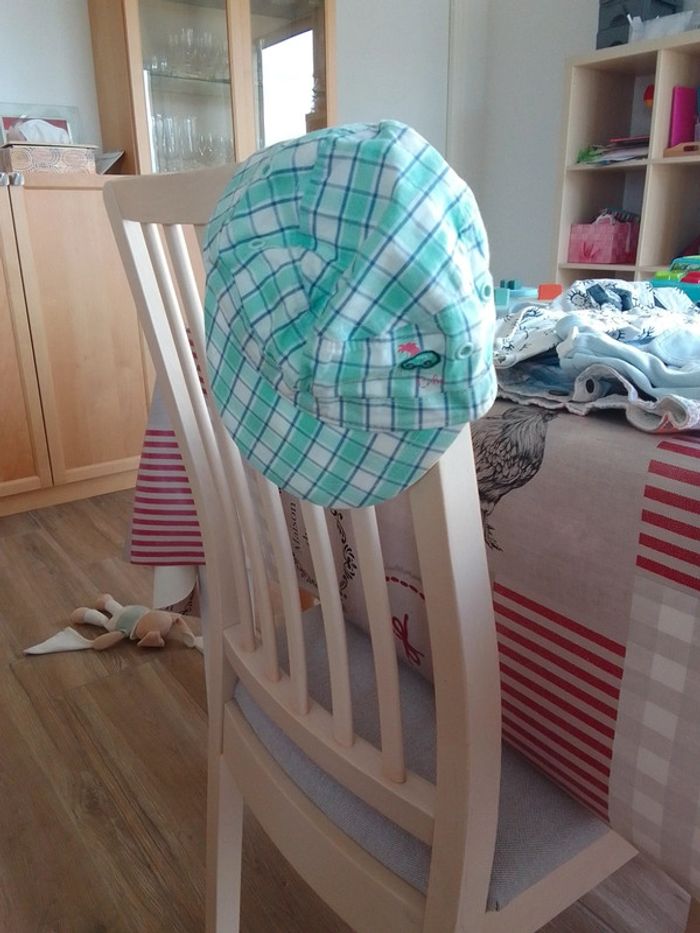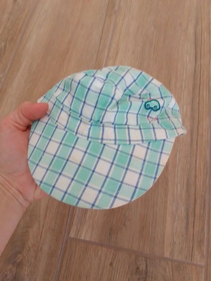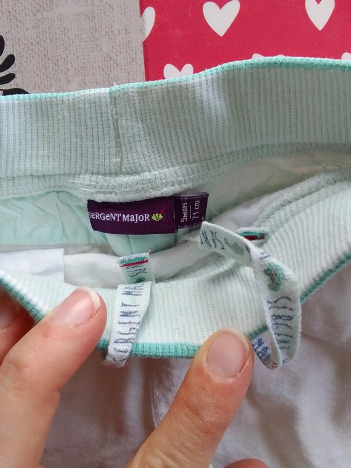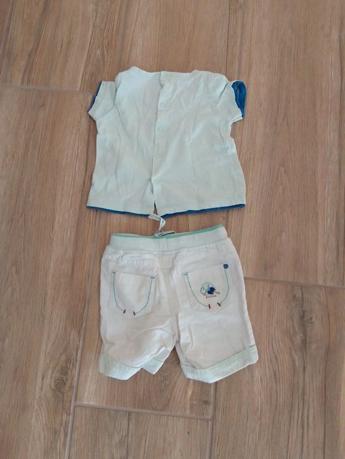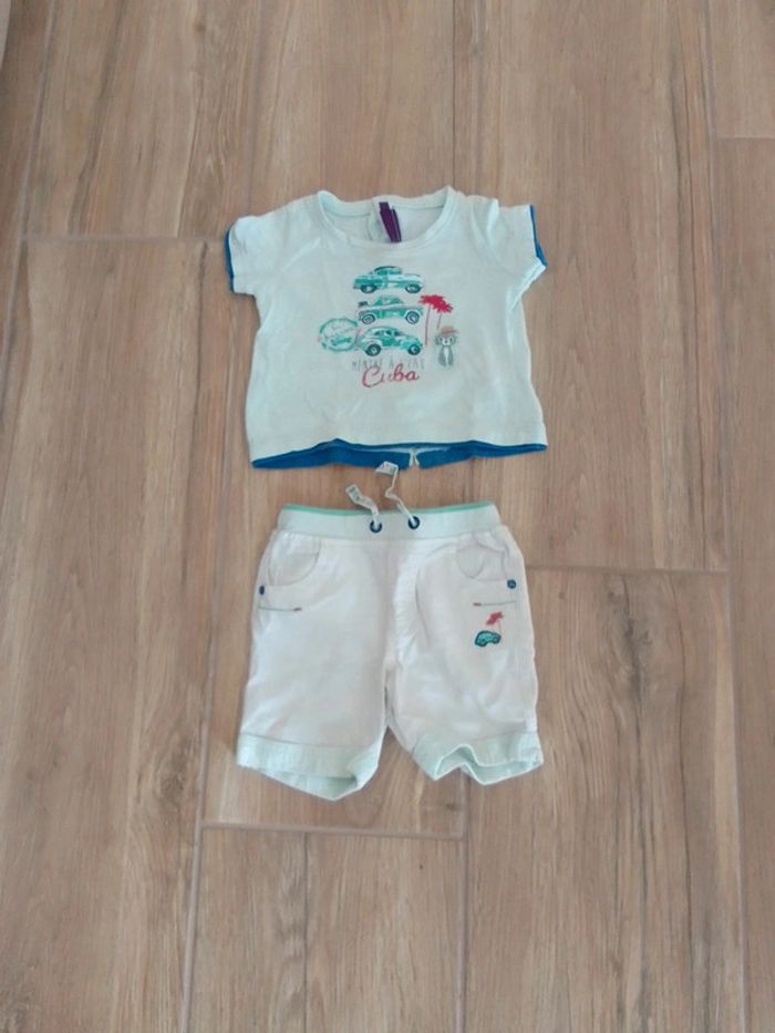 Short blanc et vert d'eau + tee short vert d'eau pressionne dans le dos sur la hauteur. Le tee short est un peu déformé d'où le prix (marque sergent major). Casquette assortie en taille 6-9 mois très pratique (scratch pour régler la taille).