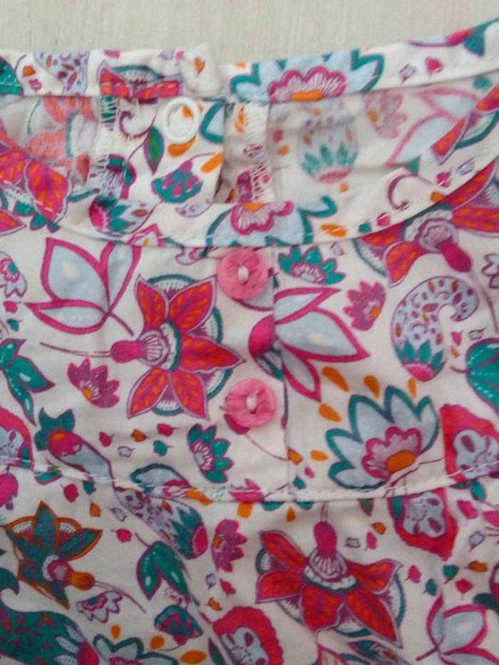 Ensemble composé d'un pantalon en double gaze, pressions a lentrejambe, taille élastique, et d'une blouse la compagnie des petits. J'offre un gilet blanc kiabi pour compléter la tenue car il a une petite tâche cf photo.