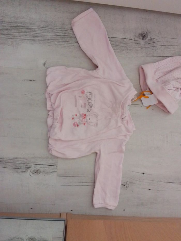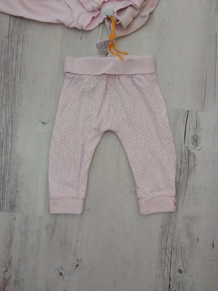 Joli ensemble en jersey confortable composé d'une veste avec pressions et d'un bas facile à porter. Qqs bouloches sur le haut, d'où le petit prix.