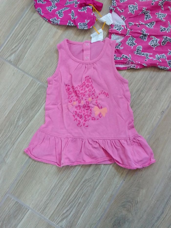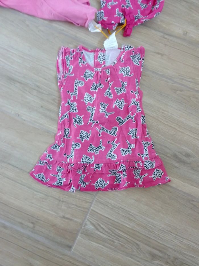 Lot composé d'une robe rose avec dessin de chat-tigre, d'une robe rose avec imprimé tigre noir et blanc et d'un bon assorti. Les robes sont pressionnees dans le dos. Peu porté car taille inadaptée à la saison ....