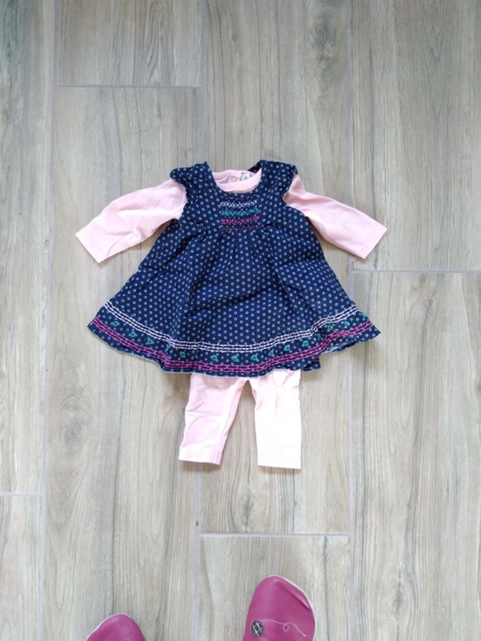 Ensemble trois pièces composé d'un legging, d'un sous pull pressionné dos sur toute la hauteur et d'une robe pressionné dos toute hauteur également. Marque orchestra. Peu porté. J'offre un body Orchestra pour l'achat de l'ensemble.