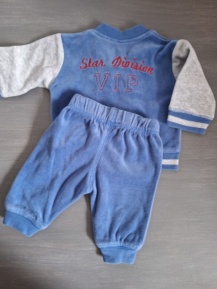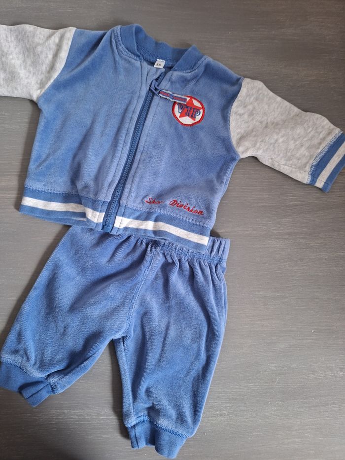 GARÇON 1 MOIS N°963 ensemble jogging Velours , bleu / gris Veste zippé Pantalon élastique Taille 80% coton 20 % polyester Taille 1mois Zeeman 4,50€ #kelly_garçon1mois