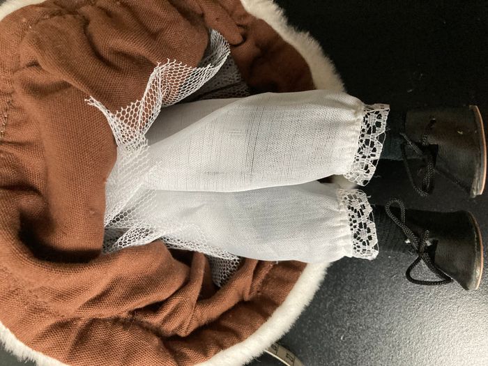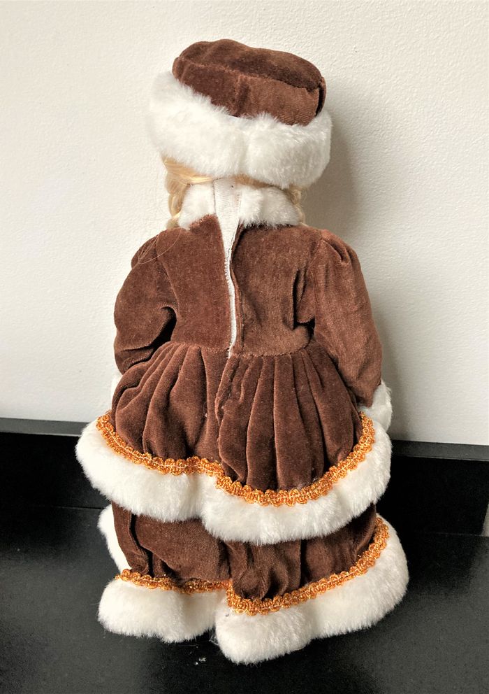 Jolie poupée blonde avec tresses, et vêtements en velours ras. Visage, mains et pieds en porcelaine. Hauteur 32 cm, Pour collection ou jouet.