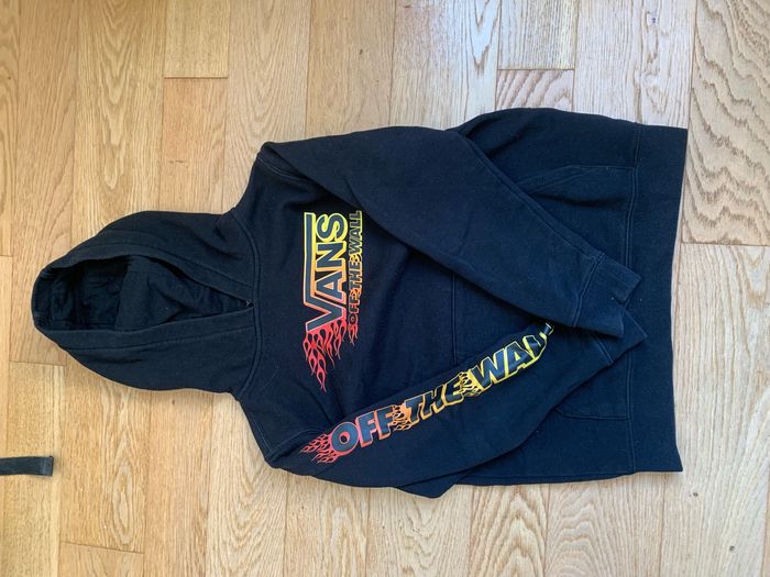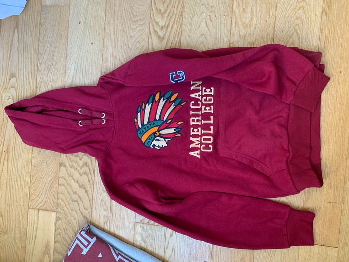 Lot de sweat-shirt et Hoodies Taille 14 ans Très bon état Un Hoodie noir Vans off the wall avec flammes Un Hoodie bordeaux Américan Collège avec tête d’indien Un sweat-shirt Américan Collège gris