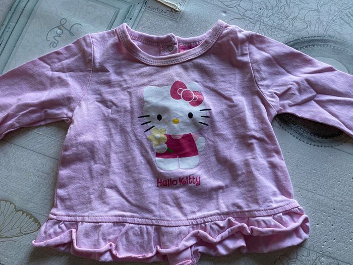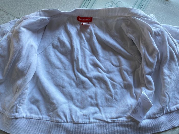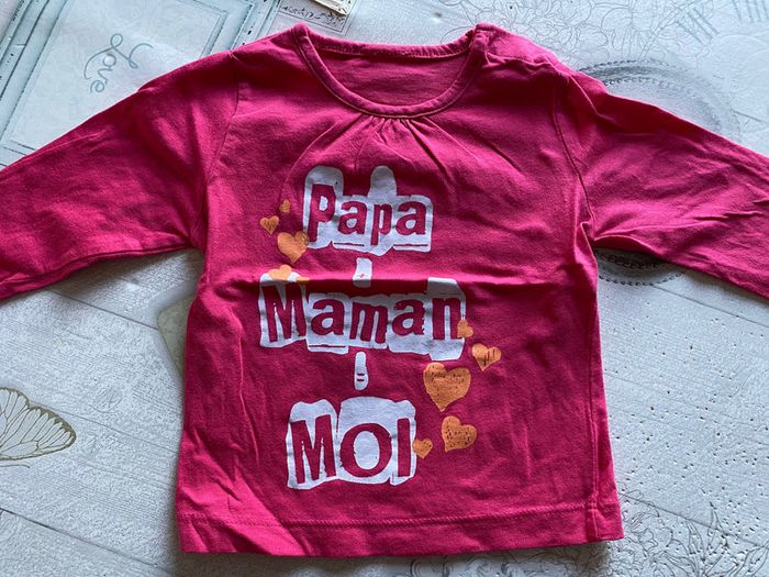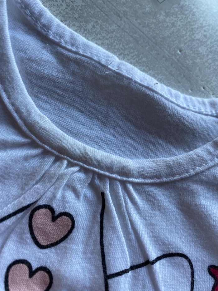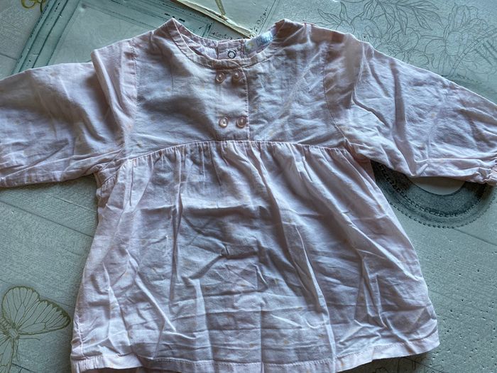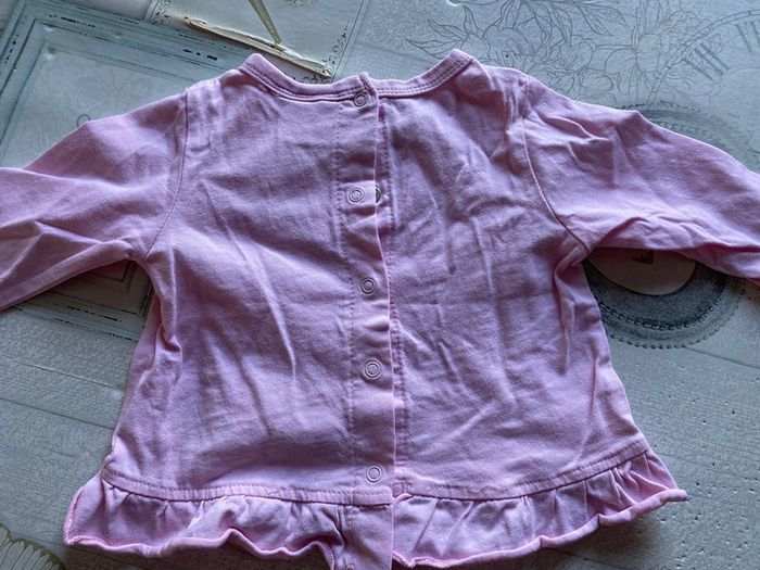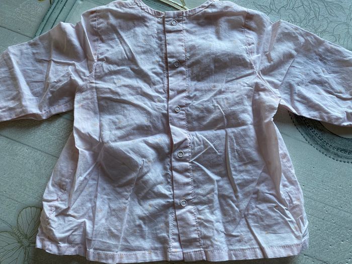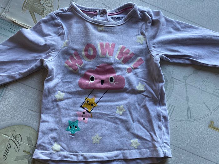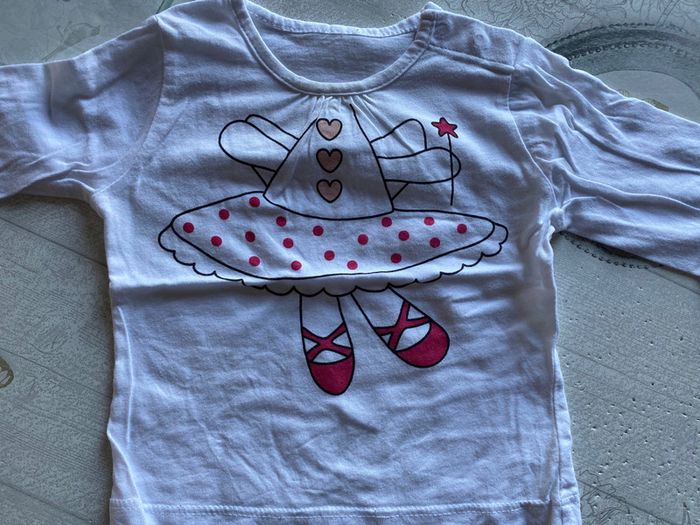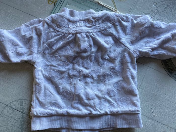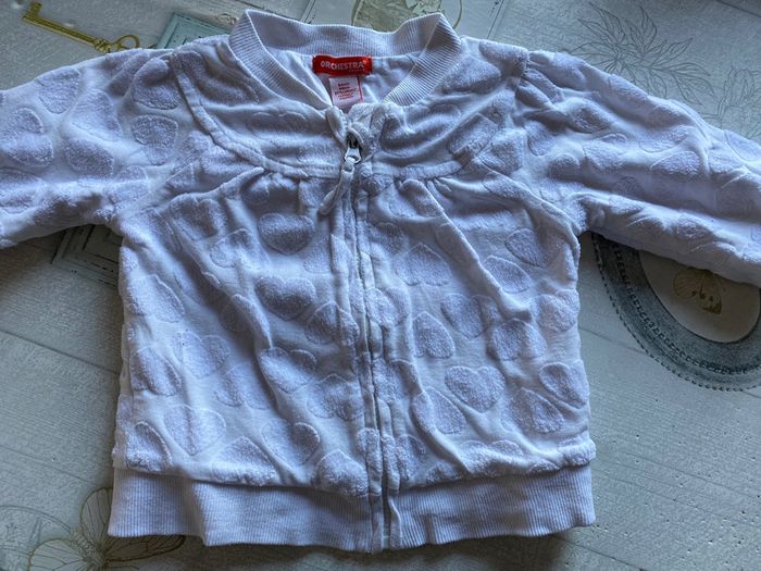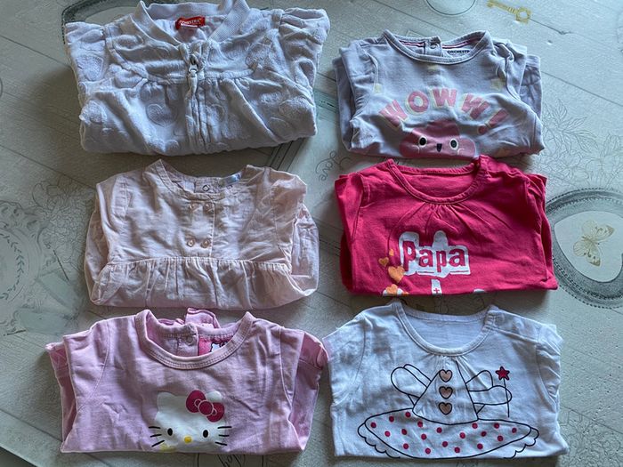 lot de vêtements en 6 mois: 5 hauts manches longues en très bon état, haut blanc col légèrement jauni(photo), une veste petit cœur beaucoup porté mais en bon état.