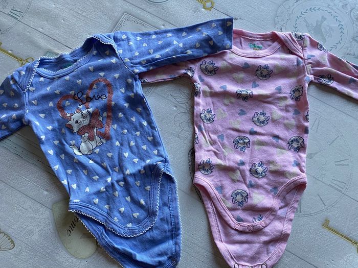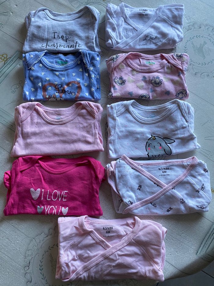 lot de 9 bodies en 6 mois en très bon état. 3 bodies ouverture sur le devant. 2 Disney marques kiabi, tex, Disney, gemo