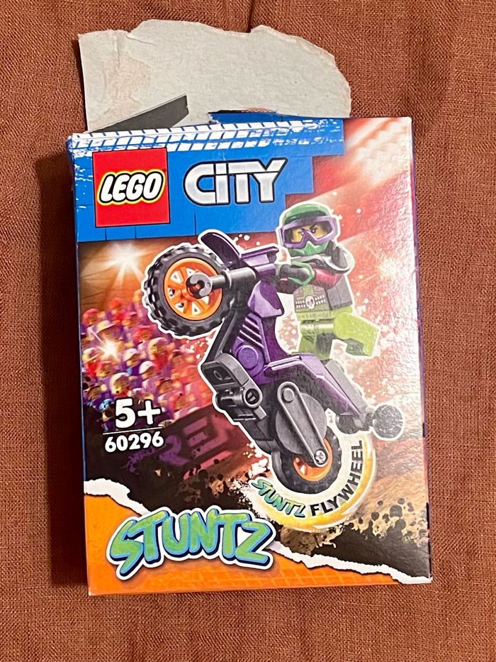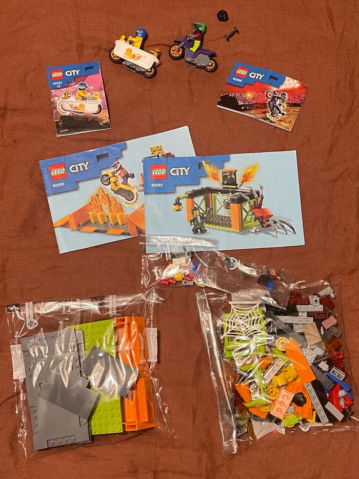 L’aire d’entraînement des cascadeurs Complet, avec pièces de rechange en plus. Vendu avec deux motos supplémentaires : - moto baignoire complète mais sans boîte - moto de cascade incomplète : manque support pour mettre les petites roues pour la cascade (peut se commander sur le site de lego) et les cheveux bleus (personnage avec casque). Cf photos LEGO 60293 60296 60333 L’aire d’entraînement des cascadeurs et deux motos
