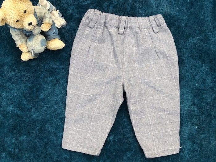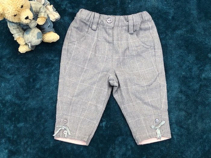 Gris clair avec carreaux rose pâle Taille ajustable par boutons Finitions bas des jambes : boutons et petit noeud Extérieur :65% polyester, 35% viscose Doublure 100% polyester Très bon état #anso92000bébé3mois