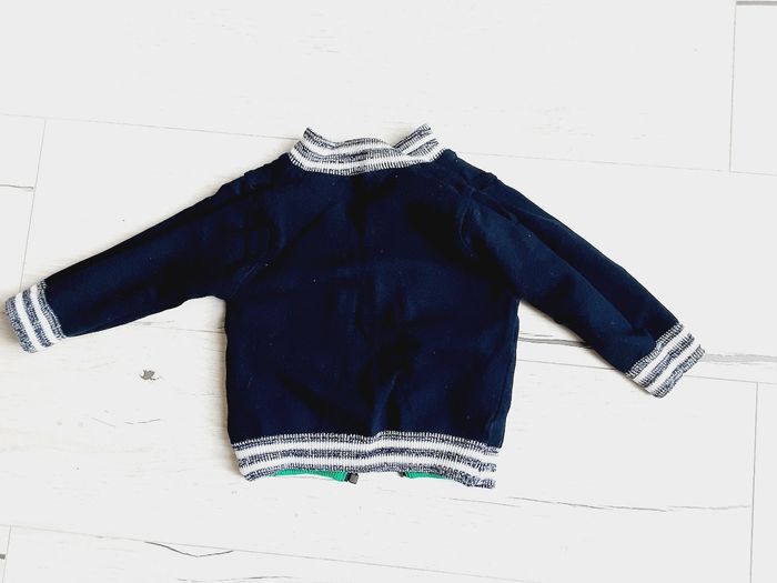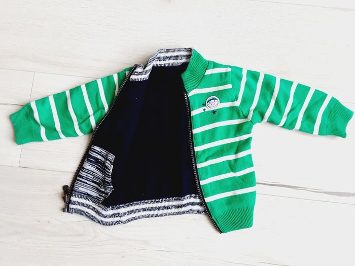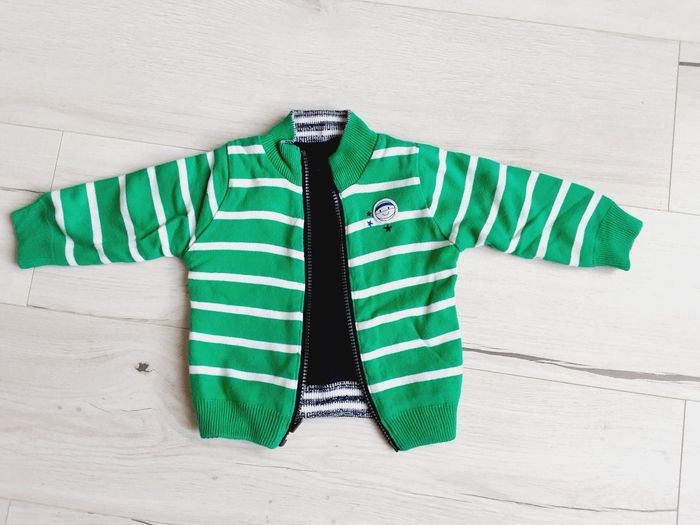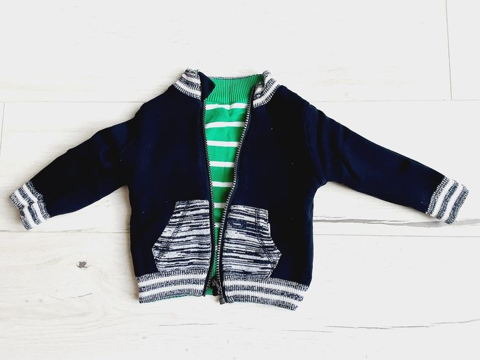 Vêtement bébé garçon gilet réversible Vert rayé et bleu marine 12 mois 1 an